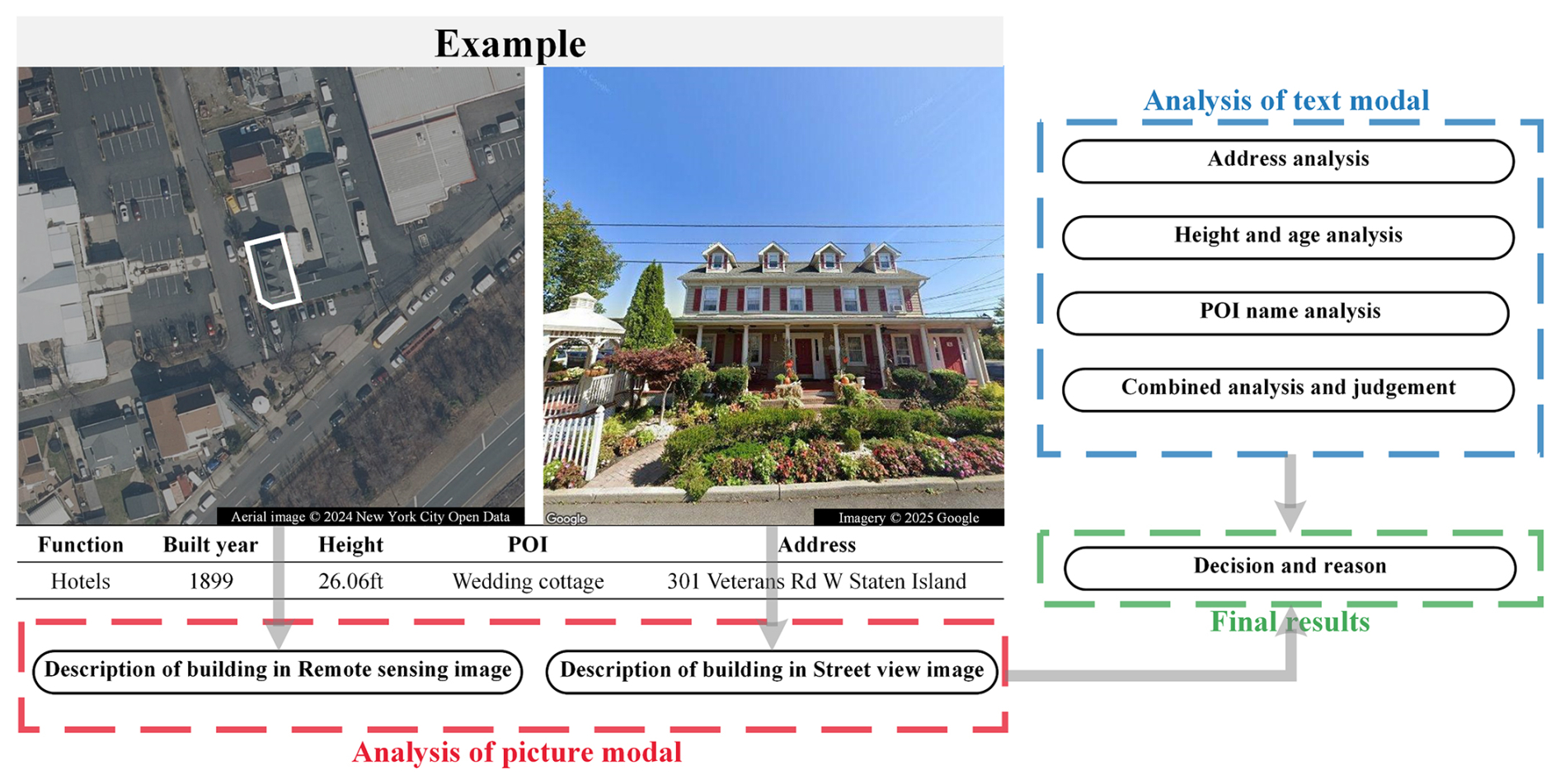 Figure 6Reasoning output of large model under the remote sensing image, street view image, and description text input. Detailed reasoning output is shown in Fig. S9.
