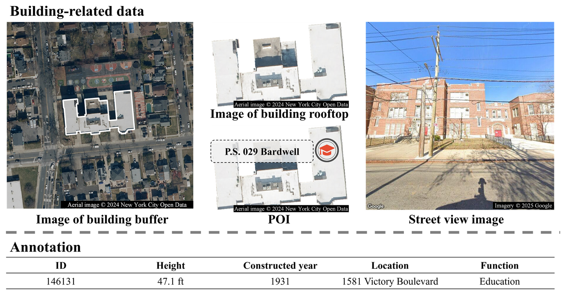The remote sensing imagery is derived from orthophotos published by the NYC government in 2018. Despite the temporal discrepancy between the orthophotos and building footprints, we deem them compatible due to the relatively limited changes in NYC's building infrastructure during the intervening period, which is subsequently confirmed during the data cleaning process (Sect. 3.2). Based on the orthophotos and building footprints, we extract top-down images of building rooftops and their surrounding 60.96 m buffer zones using the masking technique. These images represent rooftop characteristics and environmental contexts, respectively. Moreover, rooftop images could potentially be re-annotated to facilitate tasks such as rooftop material classification.