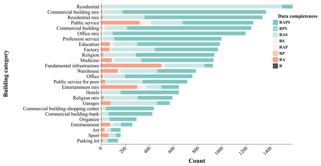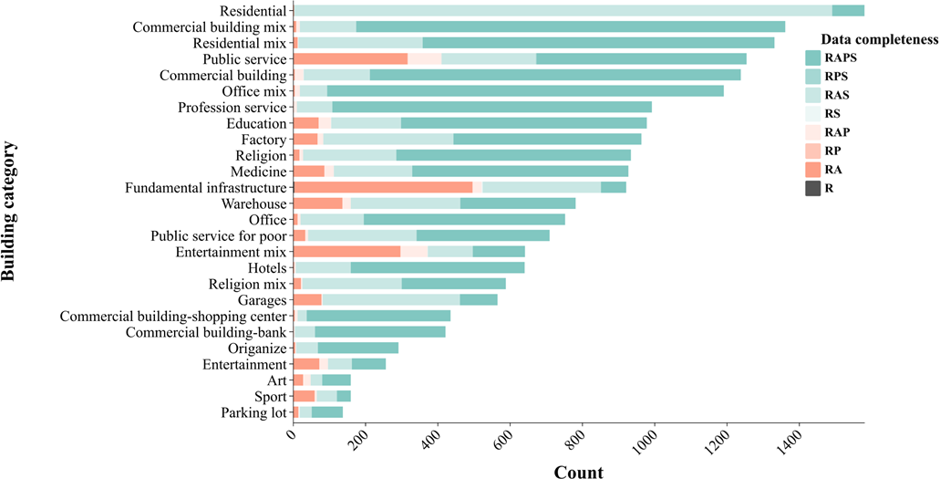 Figure 9Data completeness of each category. R refers to remote sensing imagery, A refers to annotated building attributes (building height, location, and constructed year), S refers to street view imagery, and P refers to POI data. Residential category statistics scaled by a factor of 10.