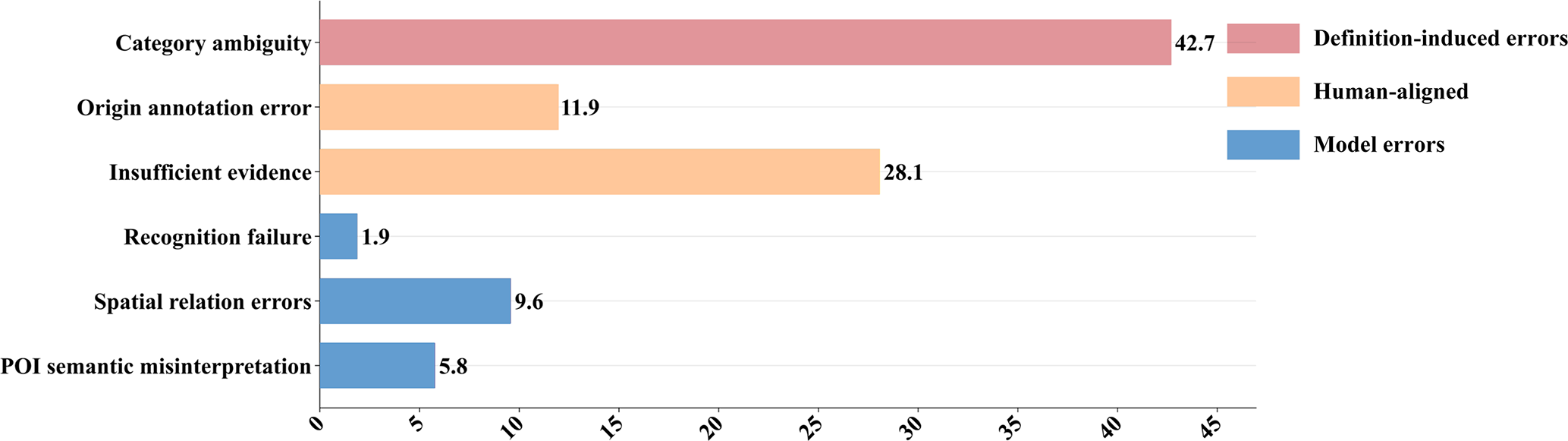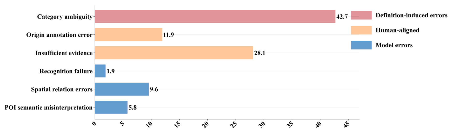 For the negative sample set, we hierarchically categorize the error sources to elucidate further large model failure modes, including three primary errors and six detailed errors. The three primary errors include (1) definition-induced errors, (2) human-aligned errors, and (3) model errors. The six detailed errors include (1) category ambiguity, (2) origin annotation error, (3) insufficient evidence, (4) recognition failure, (5) spatial relation errors, and (6) POI semantic misinterpretation (definition detailed in Sect. S3). The relationship between the primary errors and detailed errors is shown in Fig. 10. By analyzing the frequency of error causes, we aim to reveal potential directions for improving current large models and provide insight for future related research.