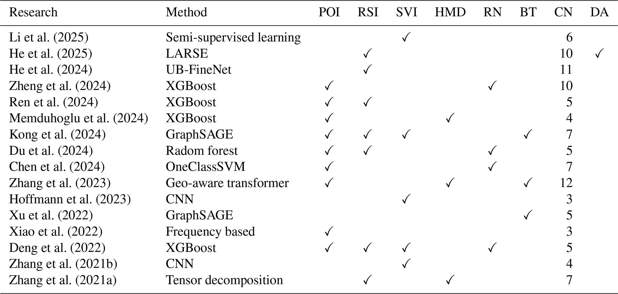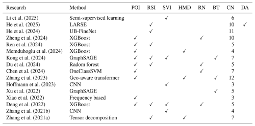 Li et al. (2025)He et al. (2025)He et al. (2024)Zheng et al. (2024)Ren et al. (2024)Memduhoglu et al. (2024)Kong et al. (2024)Du et al. (2024)Chen et al. (2024)Zhang et al. (2023)Hoffmann et al. (2023)Xu et al. (2022)Xiao et al. (2022)Deng et al. (2022)Zhang et al. (2021b)Zhang et al. (2021a)Table 1Research on building function classification between 2020 and 2025. Method refers to classification method; POI refers to point of interest; RSI refers to remote sensing image; SVI refers to street view image; HMD refers to human mobility data; RN refers to road network; BT refers to building topology; CN refers to category number of building function; DA refers to data accessibility.