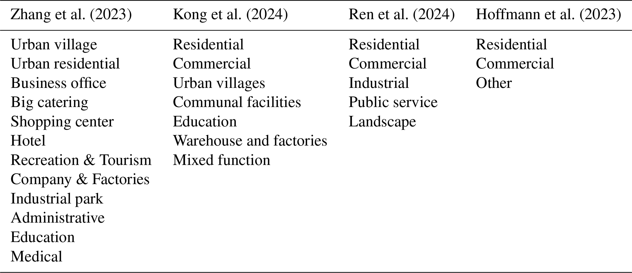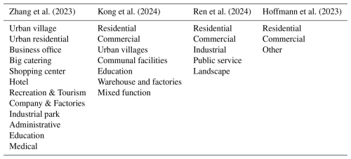 Zhang et al. (2023)Kong et al. (2024)Ren et al. (2024)Hoffmann et al. (2023)Table 2Example of typical building function categories. Building function categories 12, 7, 5, and 3 were selected from Table 1 to illustrate the current mainstream classification of building functions.