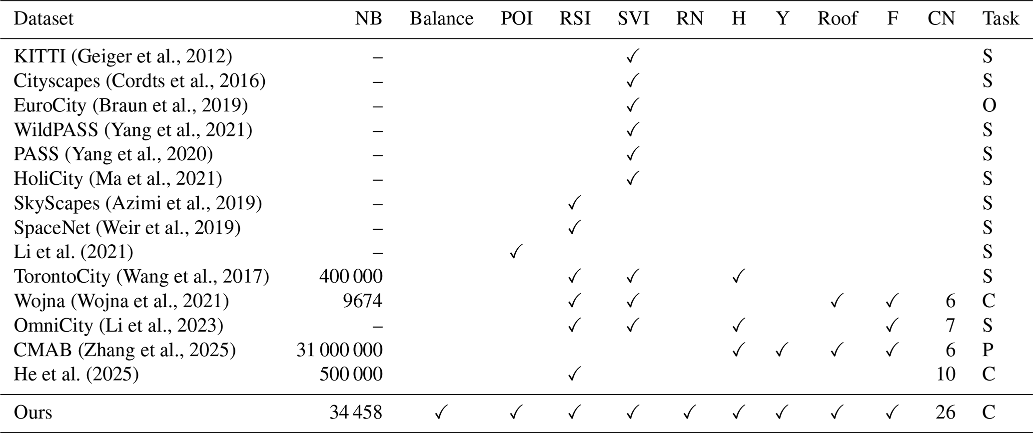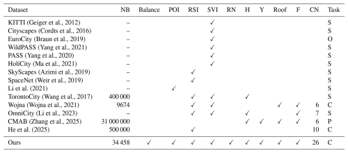 Geiger et al., 2012Cordts et al., 2016Braun et al., 2019Yang et al., 2021Yang et al., 2020Ma et al., 2021Azimi et al., 2019Weir et al., 2019Li et al. (2021)Wang et al., 2017Wojna et al., 2021Li et al., 2023Zhang et al., 2025He et al. (2025)Table 3Building-related dataset. NB refers to the number of buildings; Balance refers to whether the dataset considers each category sample of the dataset is balanced or not; POI refers to point of interest; RSI refers to remote sensing image; SVI refers to street view image; RN refers to road network; H refers to building height; Y refers to building year; roof refers to building roof; F refers to building function; CN refers to the number of function category.