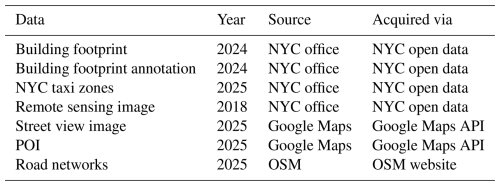 To overcome the dataset limitation, we developed BuildingSense – a novel multimodal dataset for building functions classification, comprising over 60 000 annotated images, 71 654 POIs, and 3400 building description texts in 26 distinct categories (Detailed definition is shown in Table S1 in the Supplement). It was collected based on 34 000 building footprints in New York City (NYC) (Fig. 1). To the best of our knowledge, BuildingSense is the first multimodal dataset dedicated to building function classification, offering detailed function categories. We subsequently selected four commonly used large models, including Gemini-2.5-flash (Thinking), Claude-sonnet-4, QVQ-plus, and Deepseek-chat, as baselines to evaluate the performance of large models on building function classification. Drawing from this evaluation, we discuss potential future avenues for enhancing the ability of large models to classify building function. Our main contributions are summarized as follows: