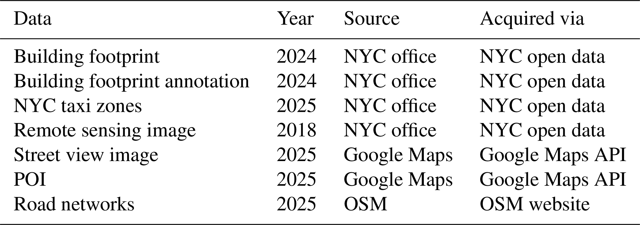 Third, from the perspective of building function data accessibility, only one paper shares its building function raw data (He et al., 2025). This situation leads to a biased comparison of building function classification methodology, restricting the development of the method. This issue is compounded by the conflict between the shared dataset and the current demand for multimodal methodology development. Thus, an open-source and multimodal building function classification dataset is in pressing need.