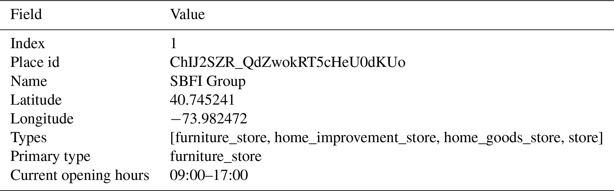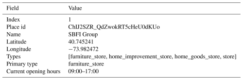 The POI data of buildings in BuildingSense are collected from Google Maps. Given the constraints imposed by API return limits, we employed a comprehensive deep-search approach to extract POI information within the boundary of the building footprint. The detailed procedure for this algorithm is shown in the Algorithm S1 in the Supplement. The collected POI data comprises several attributes: place id, name, latitude, longitude, types, primary type, and current opening hours (Table 5). Specifically, “types” and “primary type” represent the diverse and primary functions of the POIs, respectively, and “current opening hours” facilitates the future studies of dynamic building functions classification.