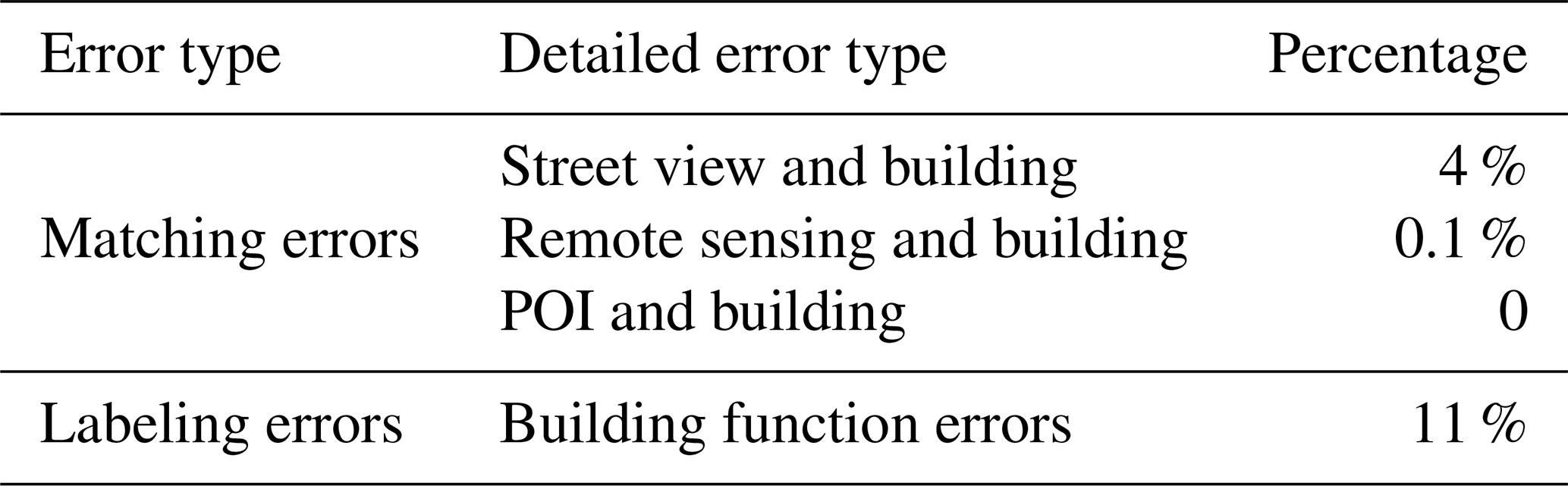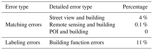Second, to further ensure the data quality, we have cleaned the errors in BuildingSense. The results of data cleaning are presented in Table 6. The fewer matching errors in the table indicate that the raw data we collected required less manual adjustment, thereby reducing human-induced errors and ensuring the quality of the dataset. Annotation errors primarily originated from insufficiently detailed labeling of interior structures in specific open-area categories, such as parks, which have been manually corrected.