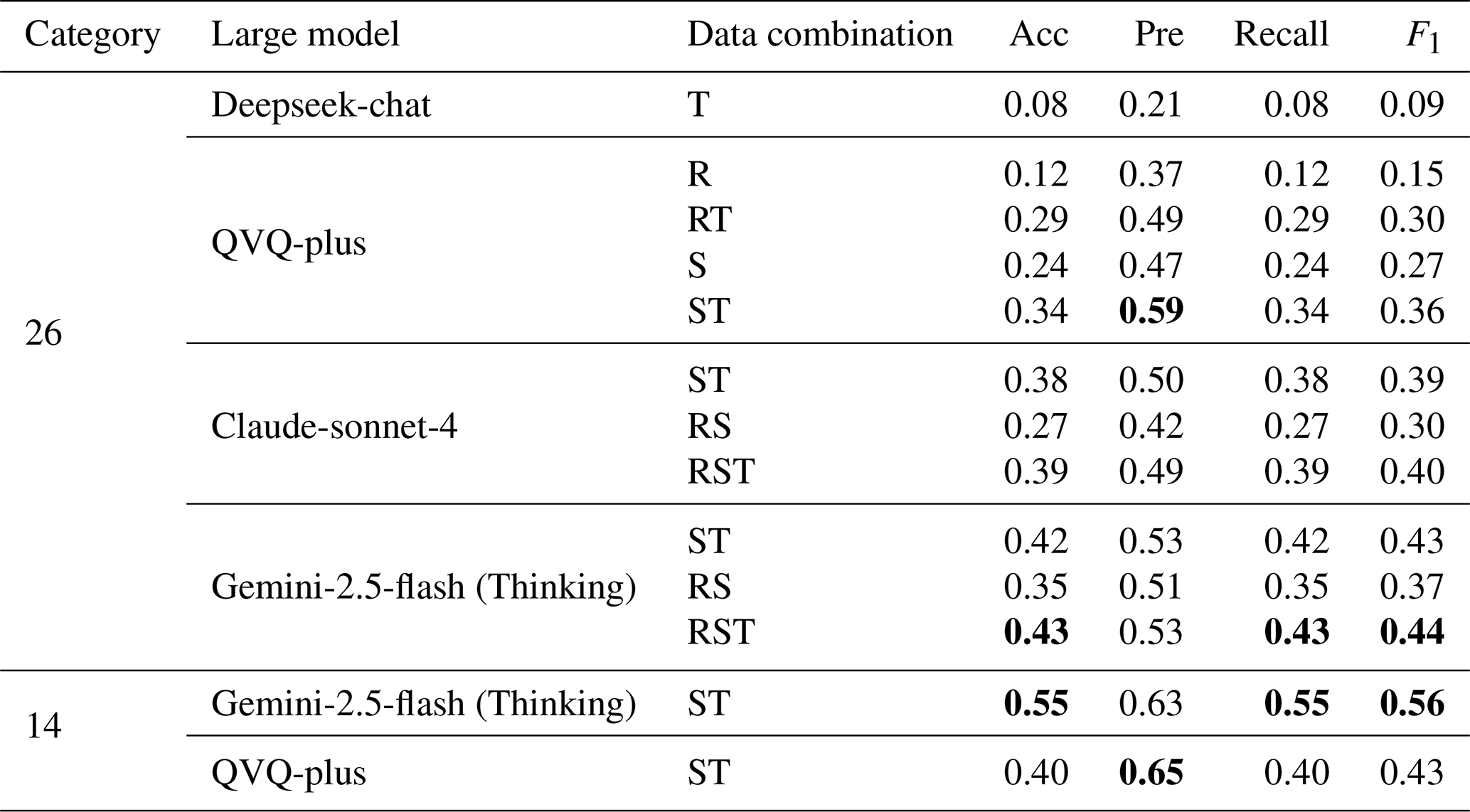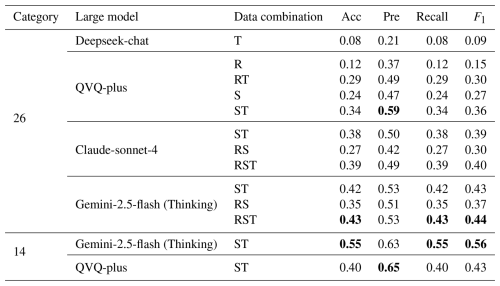 First, we evaluated performance across different categories of granularity under the ST data combination (Gemini-2.5-flash (Thinking) and QVQ-plus). The two models are chosen for their superior performance in terms of accuracy and precision. As demonstrated in Table 7, the model's accuracy improved significantly in land use classification, achieving a maximum accuracy of 0.55. Notably, this result is attained solely through prompt engineering and dual-modal data fusion (without fine-tuning or external knowledge injection). This performance is striking compared to the 0.6 accuracy reported in remote sensing-only studies (albeit with different modalities) (He et al., 2024), underscoring that the large model can comprehend the multimodal data and make logical inference. The advantage challenges that the large models remain limited in performance when they encounter multimodal spatial data.