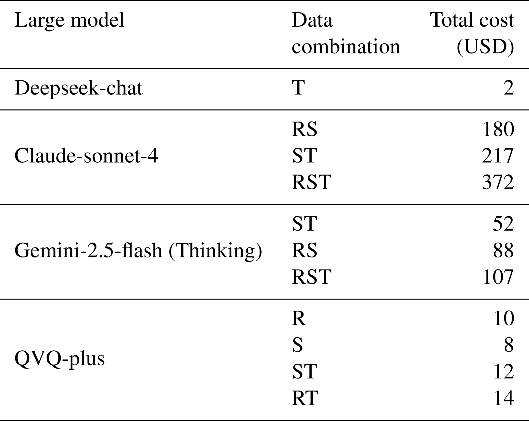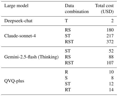 To compare the cost-effectiveness of large models, we calculated the experimental expenses under different data combinations in this study (official token costs for each model are provided in Table S5), as shown in Table 8. A price comparison revealed that Gemini-2.5-flash (Thinking), as the optimal model, does not incur the highest cost – under identical data combination inputs, its expense is only one-third that of Claude-Sonnet-4. Notably, the most affordable multimodal reasoning model is the QVQ-plus model, whose cost under the same data conditions is merely one-tenth that of Gemini-2.5-flash (Thinking). Furthermore, its excellent prediction precision ensures the correctness of model outputs, making it the most cost-effective model.