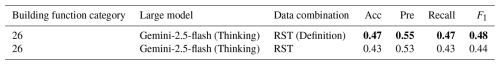 As illustrated in Fig. 6, our structured prompt template requires models to generate three components, including the analysis of the picture modal, the analysis of the text modal, and the final results. The analysis of picture modal includes the interpretation of the rooftop characteristics and the building's surrounding context, as well as the building's ground-level facade and the surrounding environment analysis. Analysis of text modal contains location geocoding, building height and year understanding, semantic analysis of POIs' names, and integrated visual-textual reasoning. The final results include the reason for the decision, building function, and additional notes. The additional notes are designed to evaluate the model's dialectical reasoning capacity. Based on the model output, we defined six criteria to assess model performance and detect hallucinations in positive samples: (1) Are remote sensing descriptions accurate? (2) Are street view descriptions accurate? (3) Are text descriptions accurate? (4) Is the combination analysis logic? (5) Are there conflicts between results and analysis? (6) Is additional information helpful? (detailed definition is listed in the Sect. S3 in the Supplement). To evaluate the best model (Gemini-flash-2.5 (Thinking)), five professionals with expertise in geographic information systems are employed to assess the positive sets based on six criteria, and one large model (Deepseek-chat) is employed to assess criteria 4 to ensure the discrimination is consistent (detailed prompt designs are provided in Sect. S2). Samples are created by selecting 20 % from each category of both negative and positive classification outcomes.