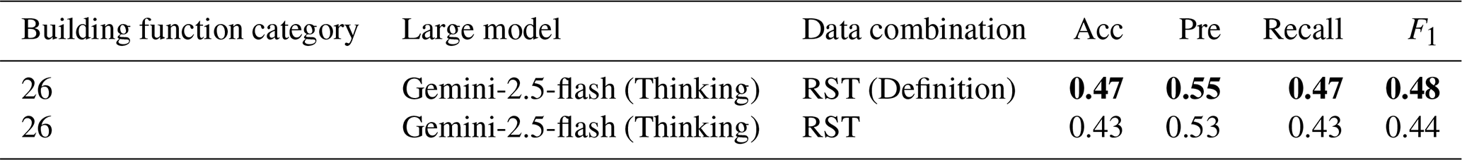 Second, based on the experimental costs in this study, the optimal model, Gemini-2.5-flash (Thinking), has an inference cost of USD 107 for 16 043 buildings in RST combinations. Such costs are prohibitively expensive for a city-level building function inference project – approximately USD 6000 for NYC. In contrast, QVQ-plus only costs around USD 12.9 for the same number of buildings. Although its inference accuracy under zero-shot conditions is relatively low, we can still see its potential in building function classification. In the future, the performance of the large models can be improved by fine-tuning the open-source multimodal models such as qwen-VL, and using RAG technology to retrieve semantic information from the building function inference knowledge base proposed in the first direction. Ultimately, it will lead to the development of a cost-effective building function classification model for data production and auxiliary annotation.