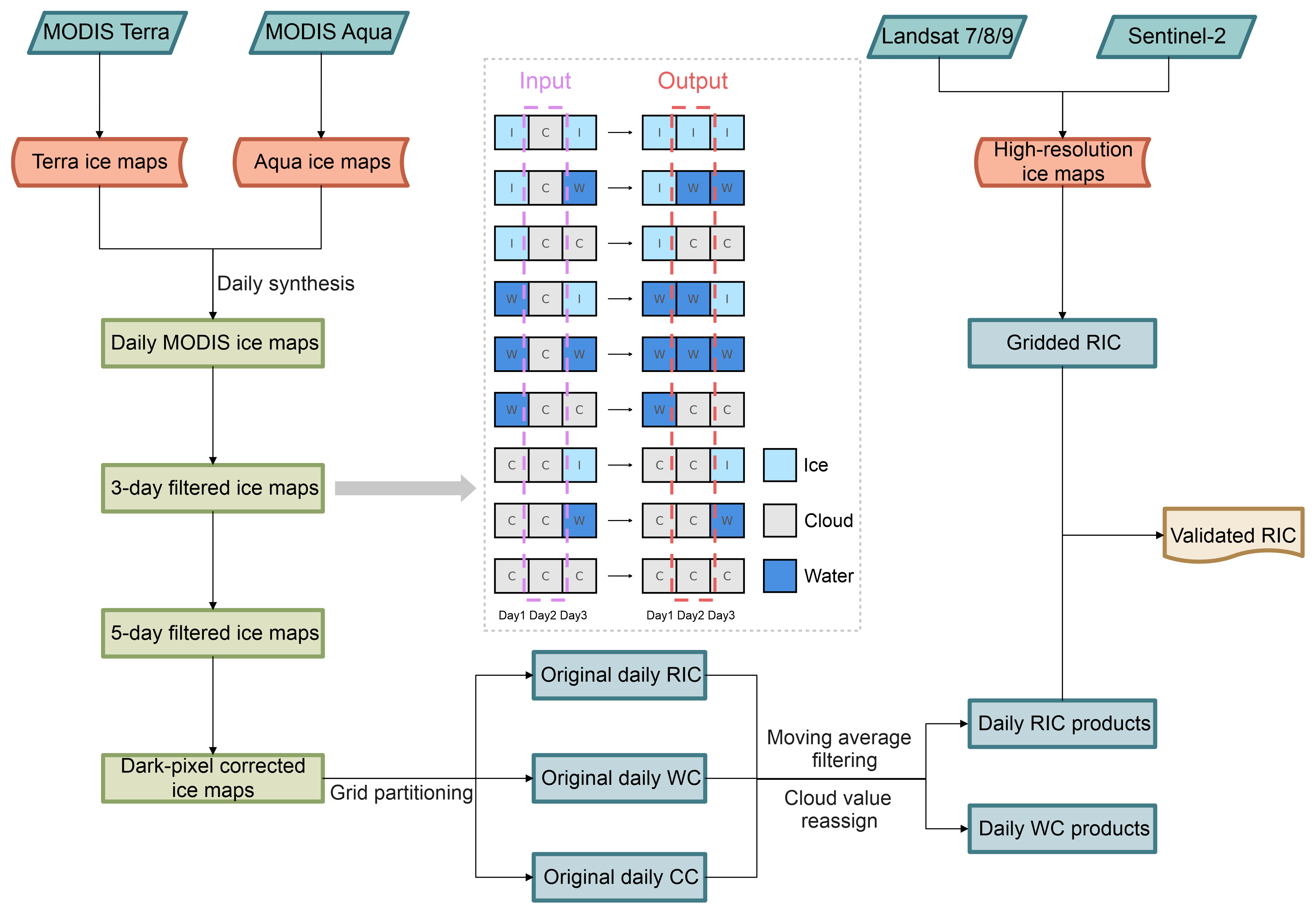 Subsequently, we construct gridded river ice products at 3 km×3 km resolution by aggregating the pixel-level classification maps. Within each grid cell, we compute RIC, water concentration (WC), and cloud concentration (CC) as the fractional abundance of ice, open water and cloud pixels, respectively. Following Zhang et al. (2024), we apply a 10 d moving-average filter to each time series to suppress high-frequency noise. Residual cloud flags are then redistributed: if RIC (or WC) exceeds 80 % in a given cell, the corresponding CC is assimilated into the dominant category; otherwise, CC is apportioned between ice and water in proportion to their relative abundances. This post-processing yields a smooth, physically consistent time-series of RIC, suitable for long-term monitoring and model-data intercomparison.