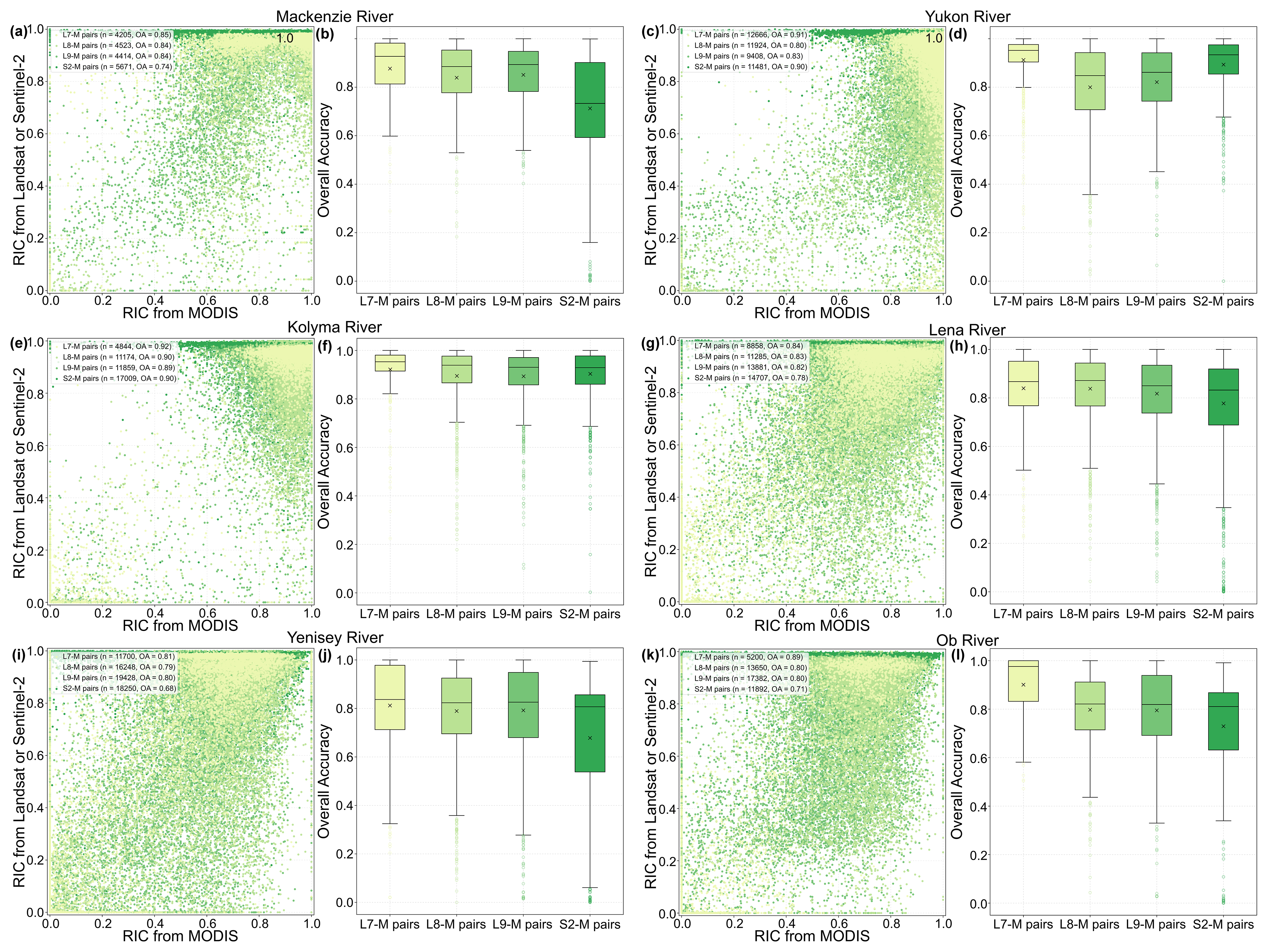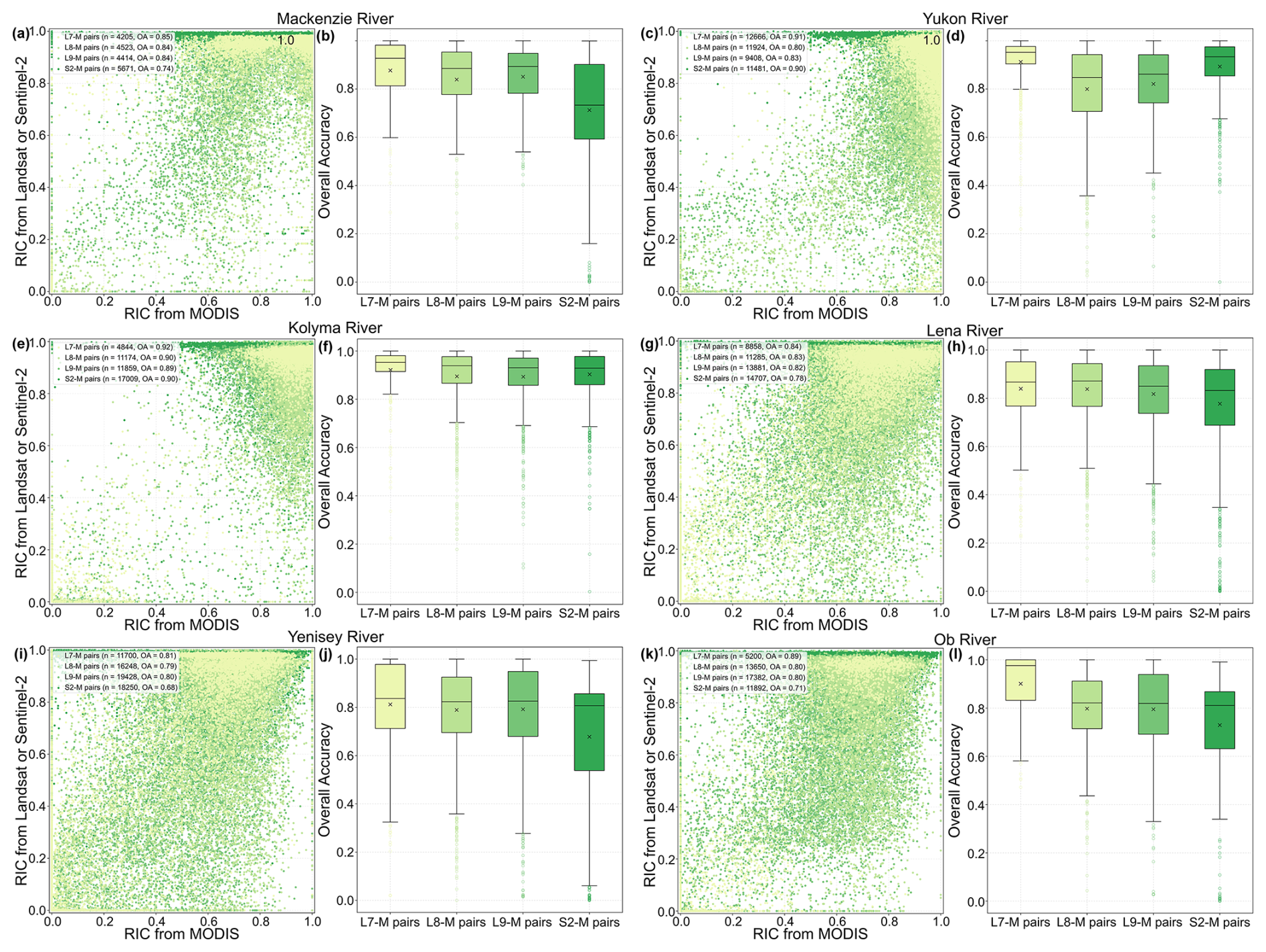 Figure 3Accuracy assessment of MODIS-derived RIC (river ice concentration) using high-resolution reference data from Landsat and Sentinel-2 across six major Arctic rivers. Left panels show pixel-wise scatterplots comparing MODIS-based RIC with higher-resolution estimates from Landsat 7, Landsat 8, Landsat 9, and Sentinel-2. Note the four matched point categories were plotted in a fixed layer order to improve visibility, with S2-M shown in the bottom layer. Right panels present the corresponding validation accuracies for each sensor pairing (L7-M, L8-M, L9-M, and S2-M). In the boxplots, the central line indicates the median, and the cross symbol denotes the mean value. Subplots (a) and (b) correspond to the Mackenzie River, (c) and (d) to the Yukon River, (e) and (f) to the Kolyma River, (g) and (h) to the Lena River, (i) and (j) to the Yenisey River, and (k) and (l) to the Ob River.