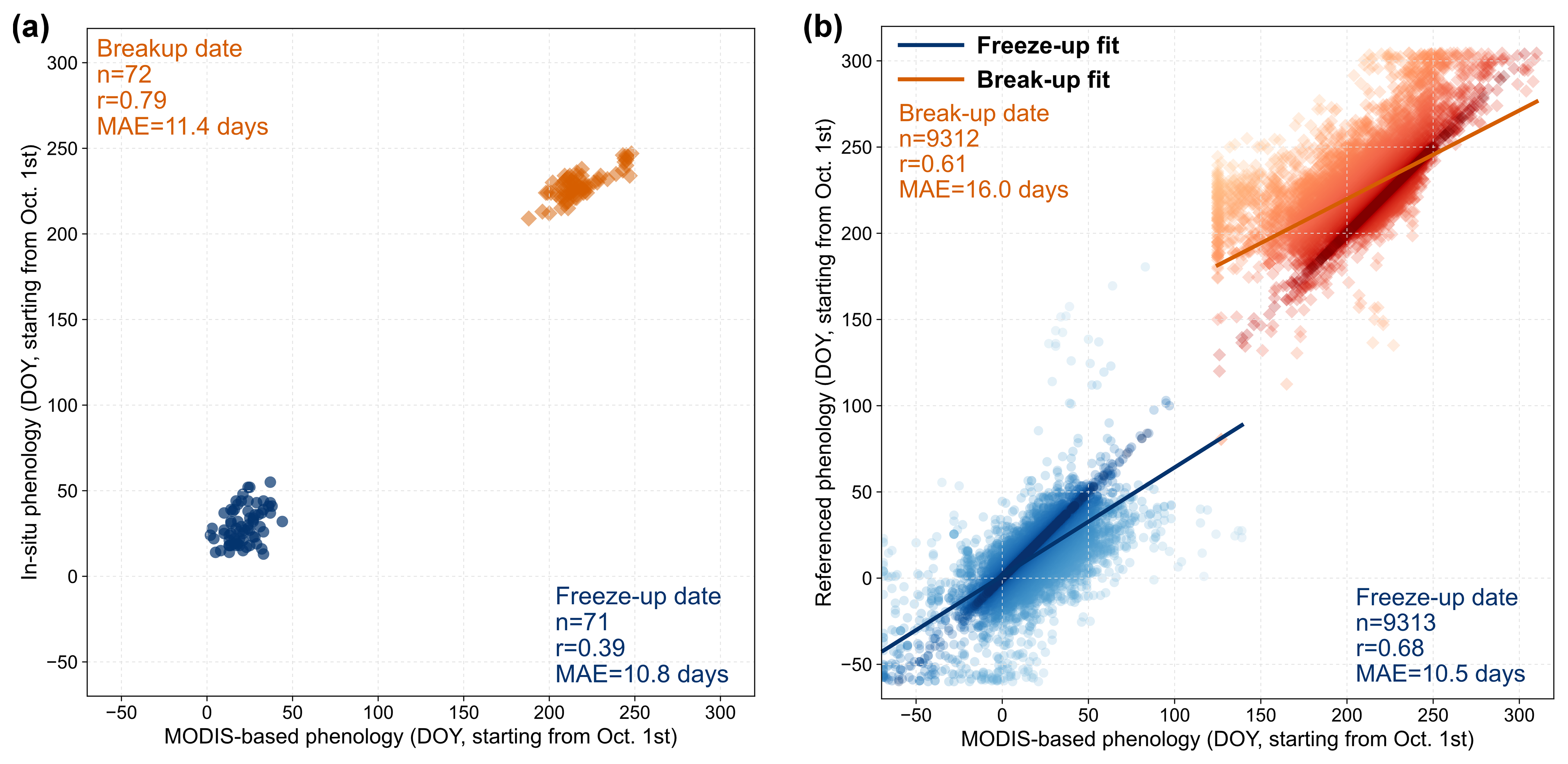 Figure 4Validation of MODIS-derived river-ice phenology (freeze-up and breakup dates). (a) Agreement with long-term in situ records. (b) Comparison of pixel-level MODIS estimates with a Landsat-derived, river-segment–based reference dataset.