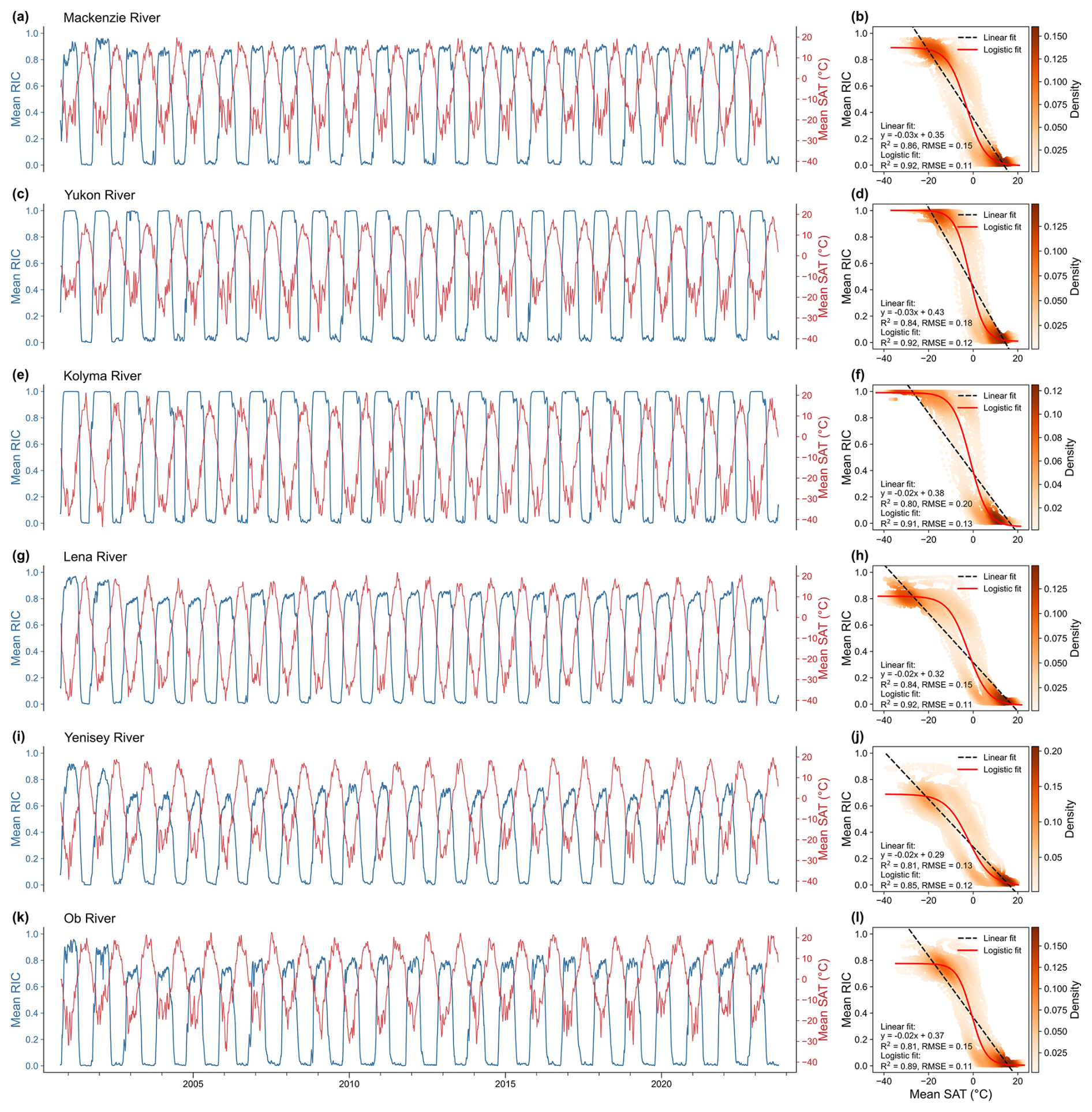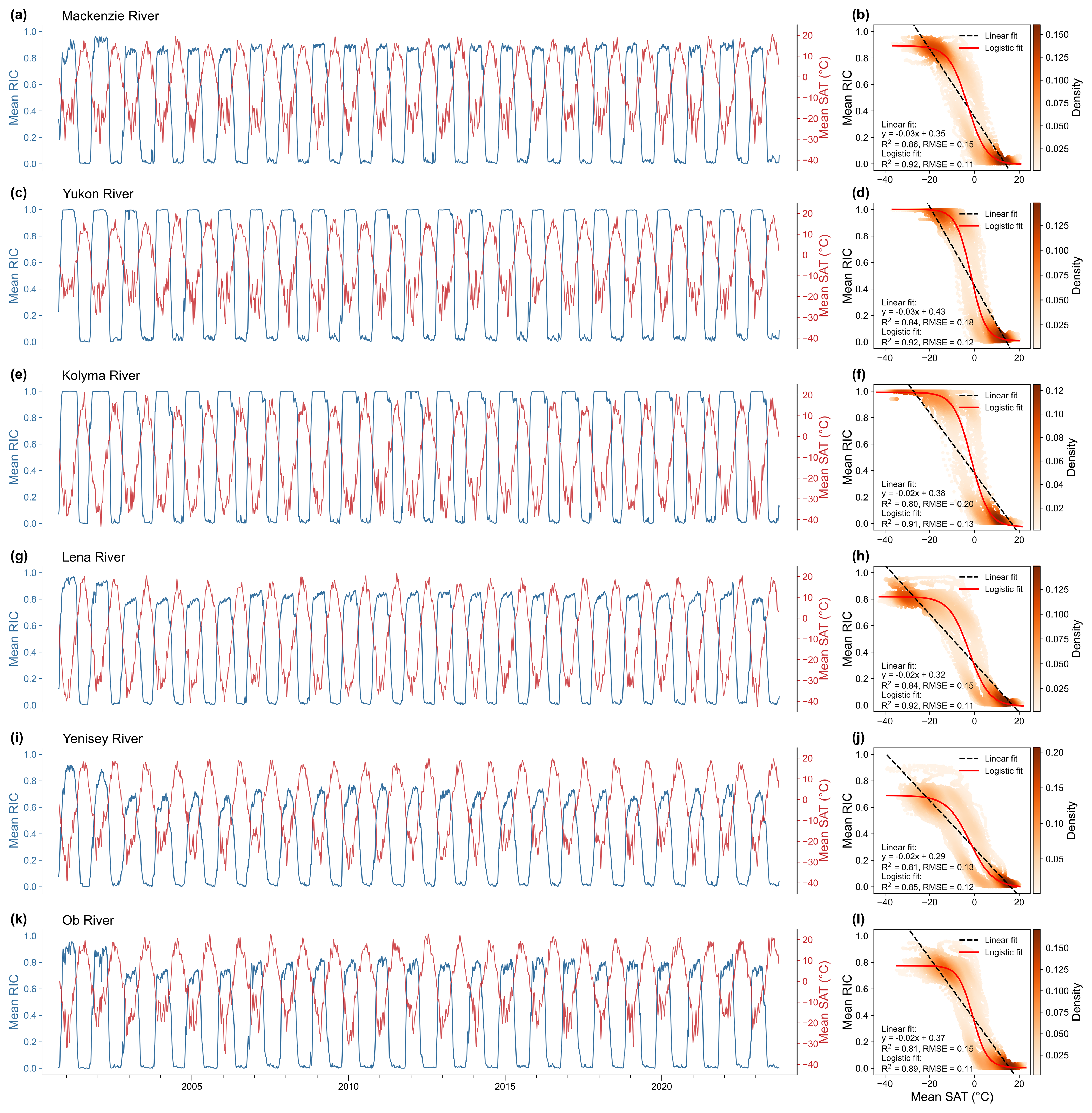 To characterize the spatiotemporal behaviour of RIC, we analysed daily time series over 24 hydrological years (2001–2024) for six major Arctic rivers (Fig. 5), together with spatial distributions of mean winter RIC (Fig. 6) and basin-scale interannual anomalies (Figs. S3–S8). The time series exhibit a pronounced seasonal cycle tightly out of phase with SAT: as SAT declines below 0 °C, basin-mean RIC rises rapidly to a stable winter plateau, followed by an equally rapid spring decline. This anti-phased relationship is strong across all basins (mean Pearson ). Although the RIC–SAT relationship shows some sigmoidal curvature, reflecting the bounded nature of RIC and saturation near fully ice-covered and open-water conditions, the central transition range is still well approximated by a linear fit, with slopes indicating a decrease of approximately 2–3 percentage points in RIC per 1 °C increase in SAT. An additional logistic fit confirms the same overall interpretation while better capturing the curvature at the warm and cold extremes. By contrast, correlations with the net solar radiation and the total precipitation show consistent monotonic but weaker negative associations (basin-mean Pearson and −0.43, and Spearman and −0.45, respectively; Figs. S9 and S10). High-latitude basins such as the Yukon and Kolyma consistently attain near-complete winter coverage, whereas lower-latitude tributaries show longer shoulder seasons and more frequent mid-winter interruptions.