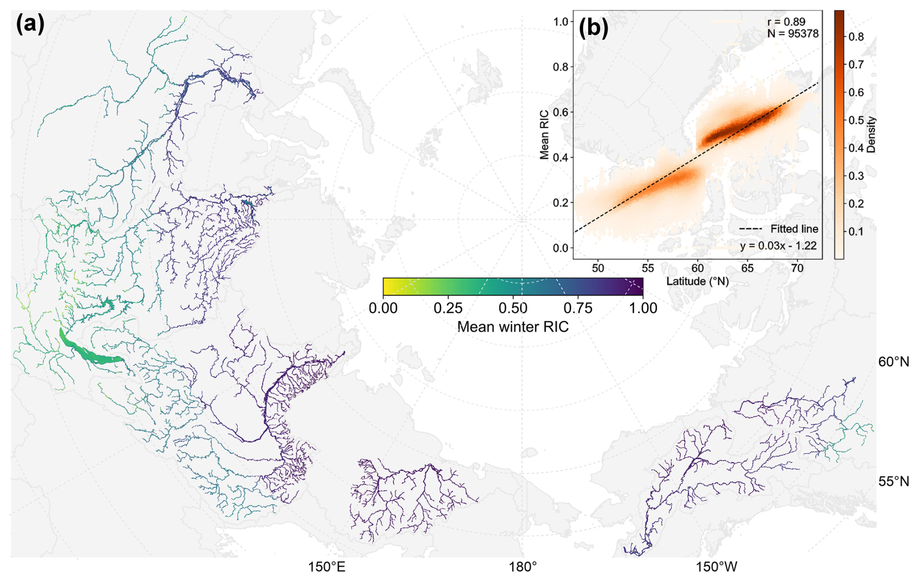 Mean winter RIC (1 October–30 April) increases systematically with latitude (Fig. 6): a pooled linear fit indicates ∼3 percentage-point increase in absolute RIC per degree north, broadly consistent with thermal control on winter ice formation. Across the domain, 4.54 % of river pixels exhibit RIC>0.95 % and 55.96 % exceed 0.70, indicating that more than half of the mapped network sustains largely continuous winter ice cover. Within basins, spatial heterogeneity follows the hydro-geomorphic template and the latitudinal gradient: winter RIC generally increases from low-latitude headwaters to high-latitude estuaries, with downstream trunk segments near the Arctic coast maintaining the highest values, whereas upper-basin, broad or multi-threaded reaches tend to retain lower winter RIC.