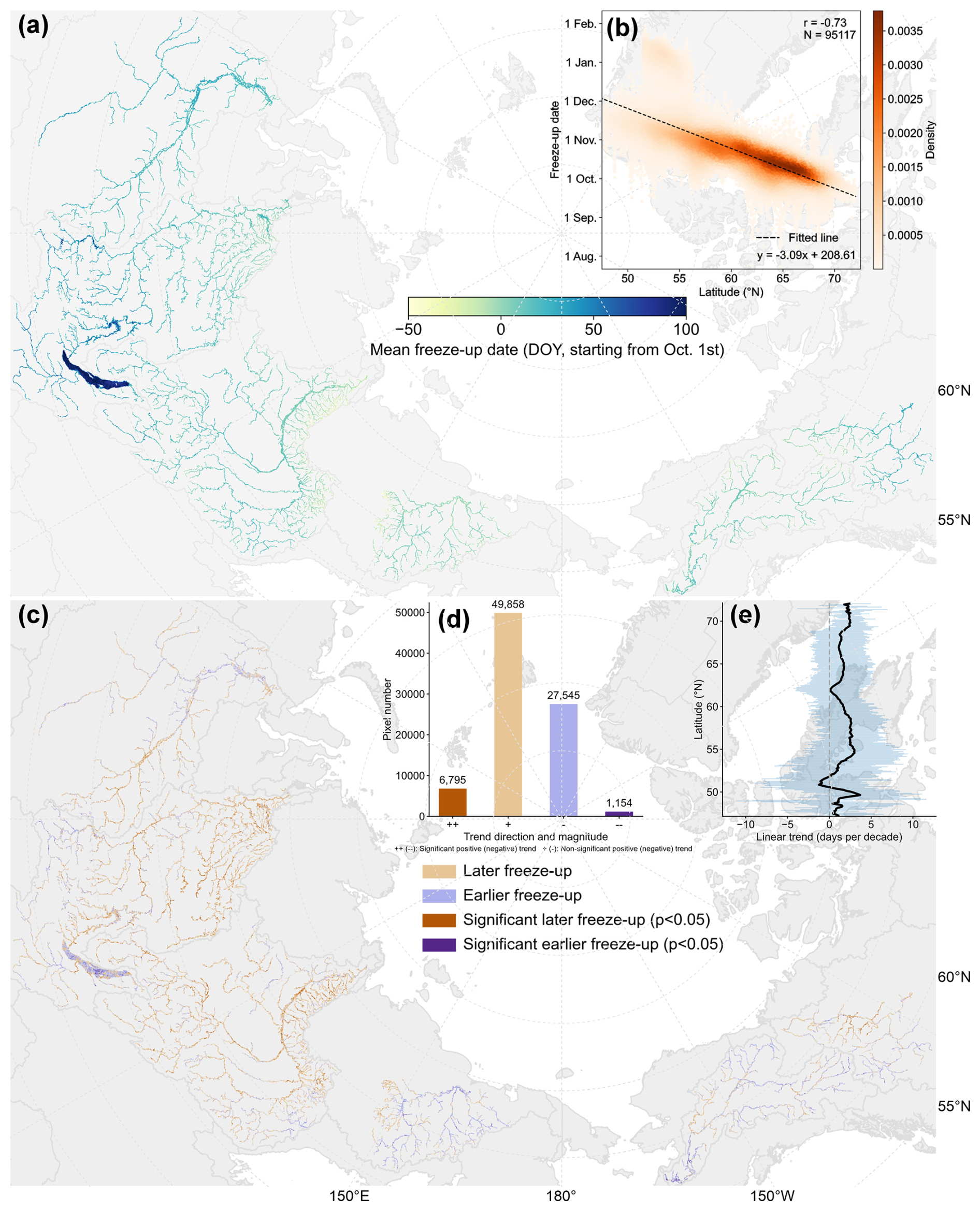 Figure 7Spatial patterns and temporal trends in river ice freeze-up date. (a) Spatial distribution of mean freeze-up date over the 24 year record. (b) Latitudinal relationship between freeze-up timing and geographic latitude. (c) Trends in freeze-up date estimated with the Theil–Sen slope; significance assessed with the Mann–Kendall test (significant pixels, p<0.05, darker tones). (d) Frequency distribution of trend directions and significance. (e) Latitude-wise distribution of mean linear trends in freeze-up timing. The background map is from HydroBASINS dataset (Lehner and Grill, 2013).