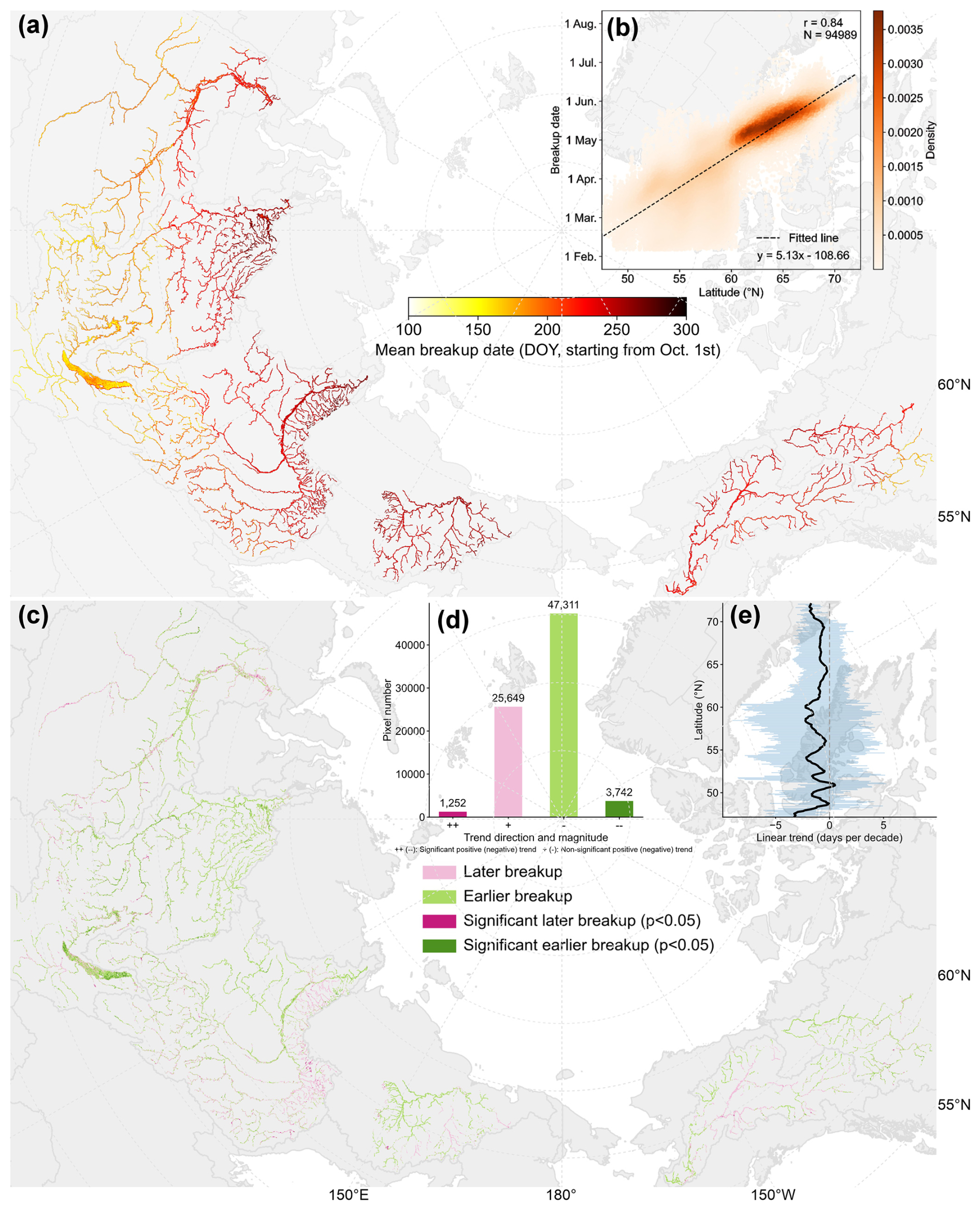 Figure 8Spatial patterns and temporal trends in river ice breakup date. (a) Spatial distribution of mean breakup date over the 24 year record. (b) Latitudinal relationship between breakup timing and geographic latitude. (c) Trends in breakup date estimated with the Theil–Sen slope; significance assessed with the Mann–Kendall test (significant pixels, p<0.05, darker tones). (d) Frequency distribution of trend directions and significance. (e) Latitude-wise distribution of mean linear trends in breakup timing. The background map is from HydroBASINS dataset (Lehner and Grill, 2013).