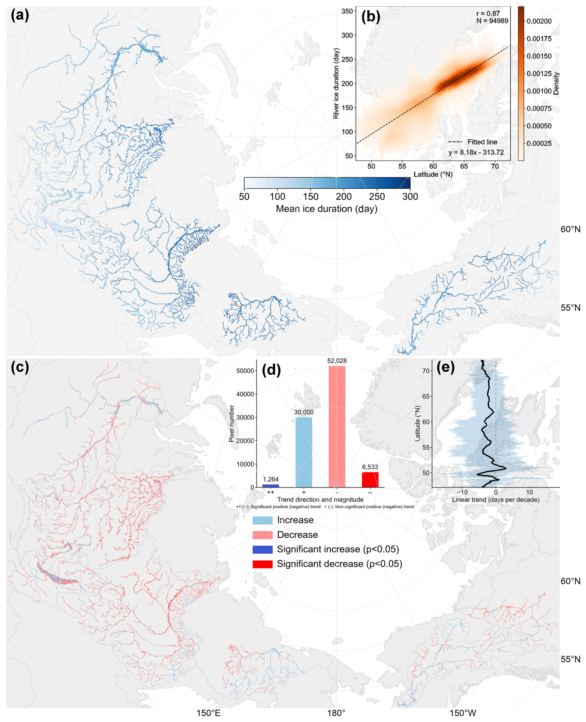 Figure 9Spatial patterns and temporal trends in river ice duration. (a) Spatial distribution of mean ice duration over the 24 year record. (b) Latitudinal relationship between ice duration and geographic latitude. (c) Trends in ice duration estimated with the Theil–Sen slope; significance assessed with the Mann–Kendall test (significant pixels, p<0.05, highlighted). (d) Frequency distribution of trend directions and significance. (e) Latitude-wise distribution of mean linear trends in ice duration. The background map is from HydroBASINS dataset (Lehner and Grill, 2013).