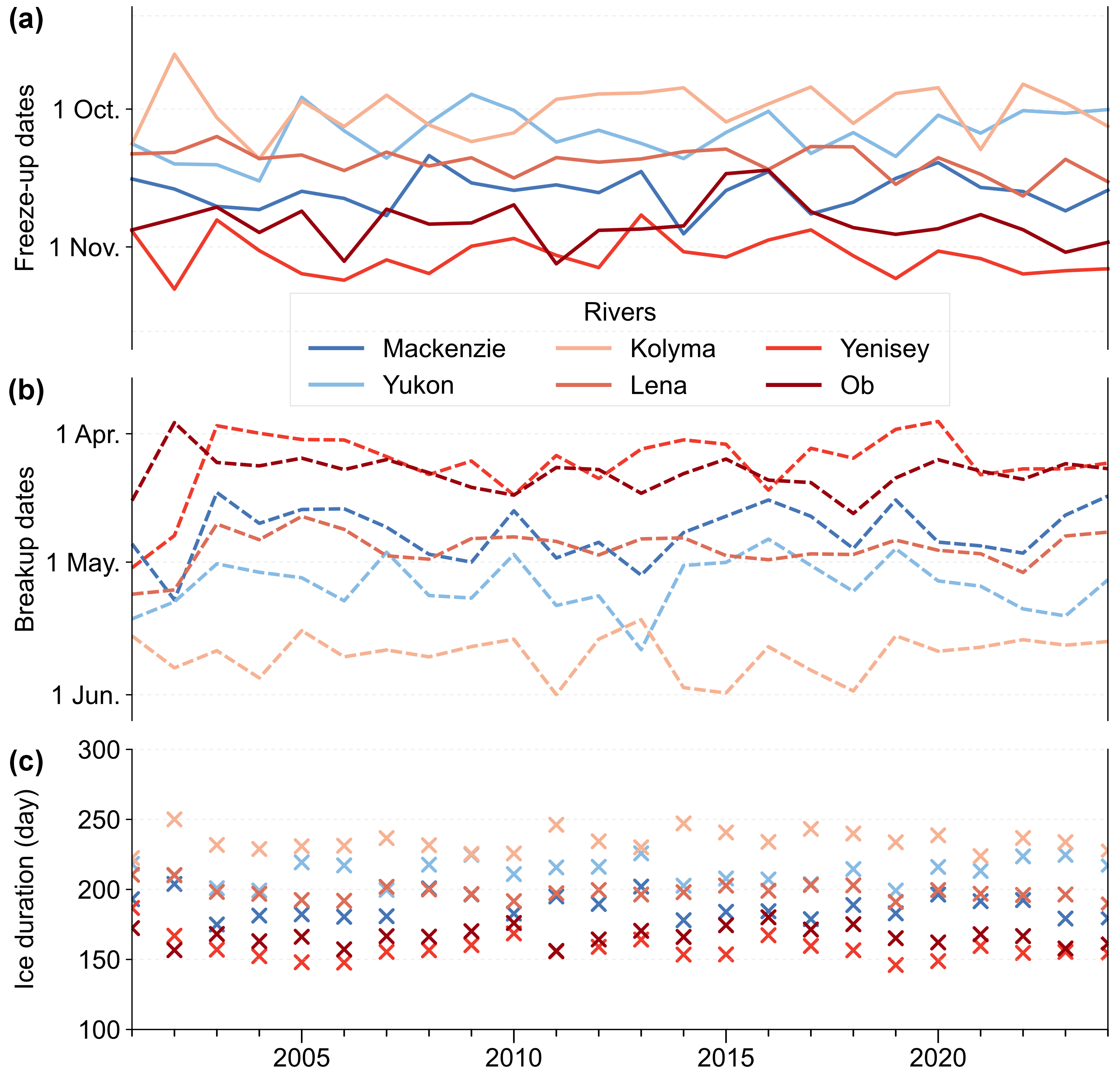 Validation against higher-resolution RIC derived from Landsat 7/8/9 and Sentinel-2 indicate a basin-mean accuracy of 0.83 (up to 0.90 for the Kolyma). Phenology derived from the MODIS-based RIC is further evaluated against in situ observations and a recently developed river-segment phenology dataset, achieving MAE of 10.8/11.4 d (FUD/BUD) for the in situ comparisons and 10.5/16.0 d for the referenced dataset. Spatiotemporal analyses reveal strong covariation of RIC with surface air temperature and latitude (mean Pearson and 0.89, respectively). More than 66 % of river segments exhibit delayed freeze-up, over 65 % show earlier breakup, and over 65 % exhibit a shortened ice season, with the average FUD delayed by 9.0 d, BUD advanced by 7.8 d, and ice duration shortened by 14.1 d over the study period.