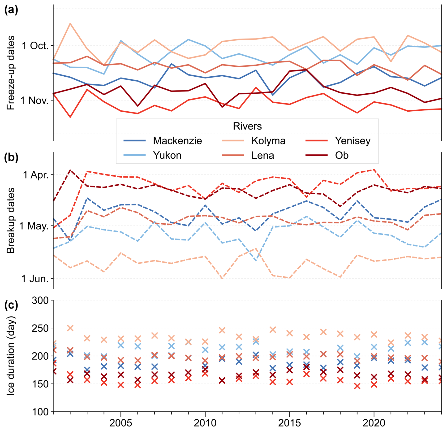 Figure 10Annual records of river ice phenology – freeze-up date (a), breakup date (b), and ice duration (c) – reported as basin-mean values across six major Arctic rivers.
