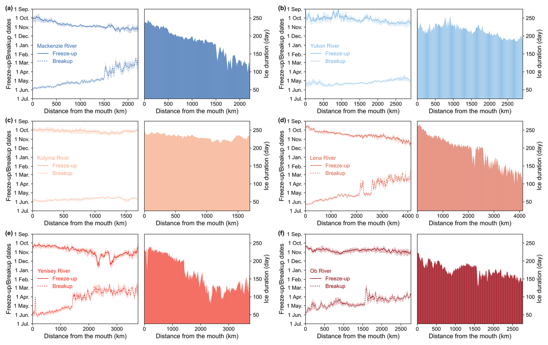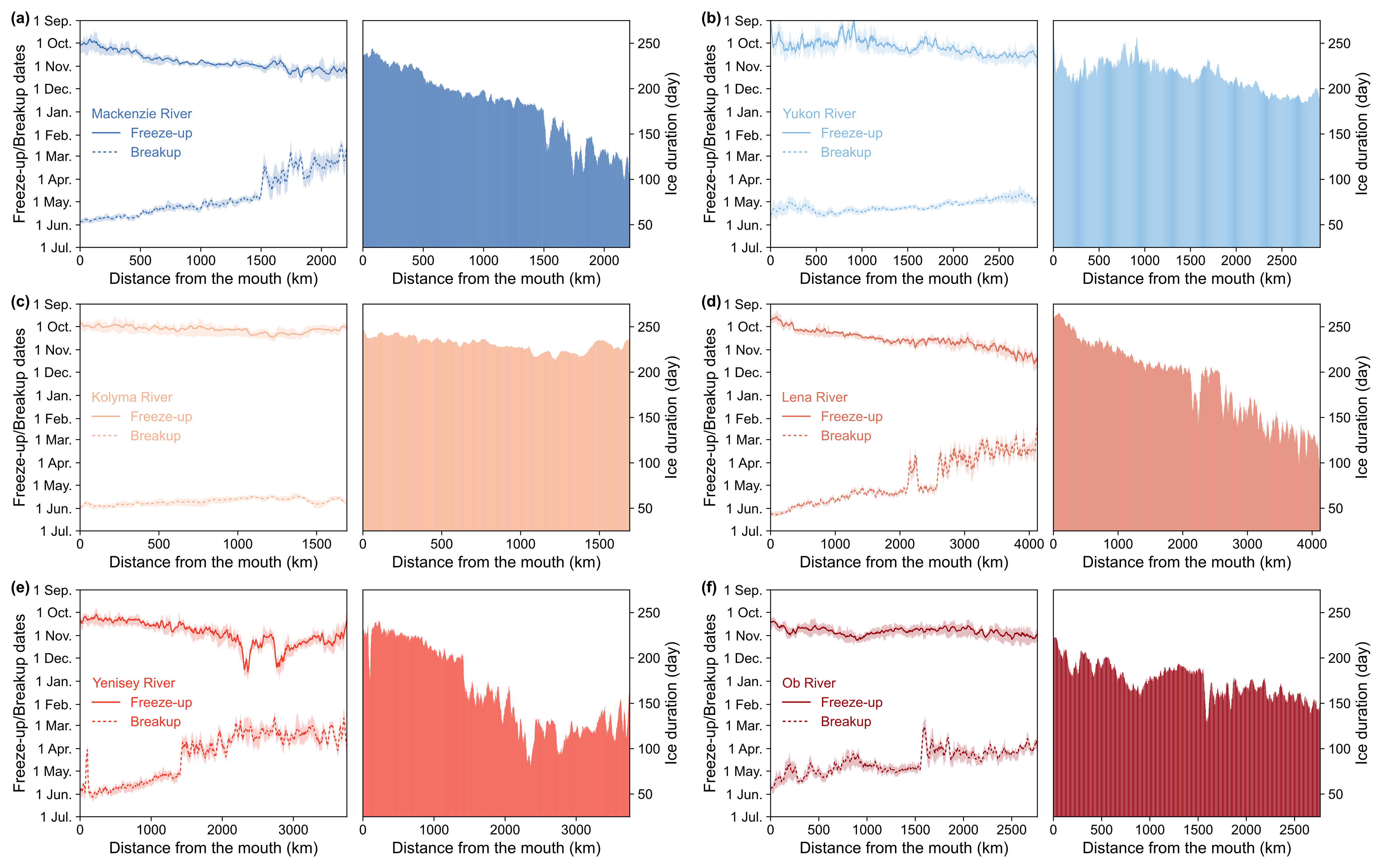 Figure 11Spatial variations in river ice phenology along six major Arctic rivers. River ice freeze-up, breakup, and duration characteristics are shown for the (a) Mackenzie, (b) Yukon, (c) Kolyma, (d) Lena, (e) Yenisey, and (f) Ob rivers. For each river, the left panel shows the 24 year mean freeze-up and breakup dates as a function of distance from the river mouth along the main channel, with shaded bands indicating the interquartile range across the 24 hydrological years. The right panel shows the corresponding 24 year mean ice duration along the same transect. Phenology curves were smoothed using a 10-point moving average.