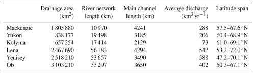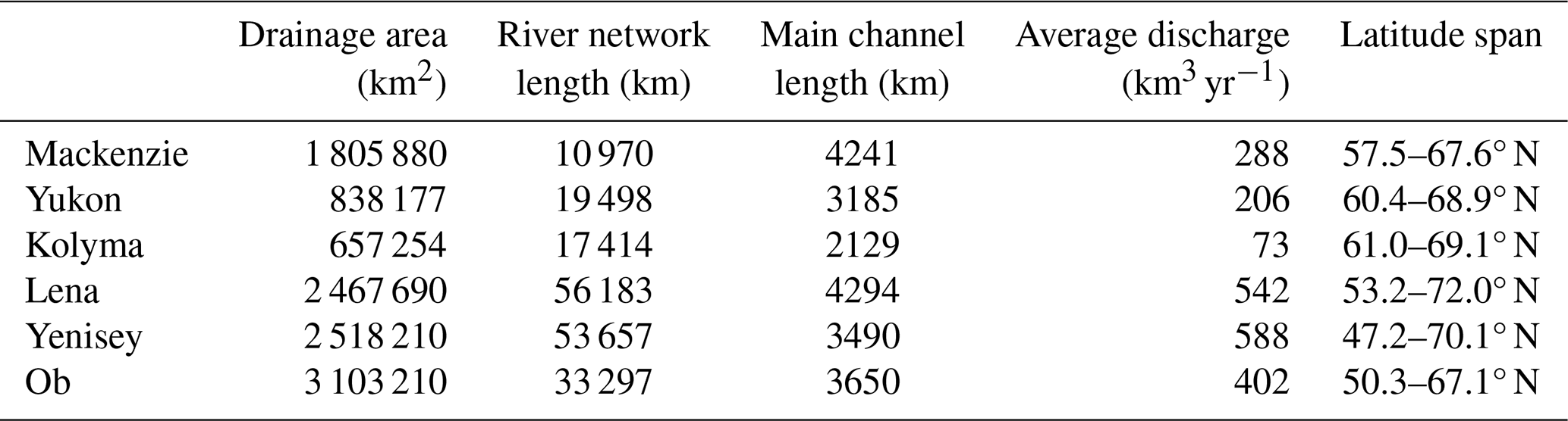 This study focuses on six major Arctic rivers – the Yukon, Mackenzie, Ob, Yenisey, Lena, and Kolyma – which span high latitudes (47.2–72.0° N) across North America and Eurasia, collectively draining extensive areas ( km2) into the Arctic or North Pacific Oceans (Allen and Pavelsky, 2018), as outlined in Fig. 1 and summarized in Table 1. These rivers exhibit substantial annual freshwater discharge – collectively averaging approximately 2099 km3 yr−1 – with five of them (excluding the Yukon River) accounting for about 45.1 % of the total freshwater inflow to the Arctic Ocean (Holmes et al., 2021; Osadchiev et al., 2023). Their discharge is primarily driven by spring snowmelt and summer precipitation, and they are characterized by pronounced seasonal cycles of river ice freezing and breakup (Holmes et al., 2013; Feng et al., 2021). Their basins generally experience cold climates, with annual average temperatures typically below 0 °C, and varying degrees of permafrost and glacier coverage, making them critical indicators of climate-driven environmental changes in the Arctic (Frey and McClelland, 2009; Liu et al., 2022).