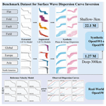 Despite the importance of diverse datasets for deep learning methods, the construction of benchmark datasets specifically for surface wave dispersion curve inversion remains limited. In contrast, other areas of seismic research have seen the successful creation of large-scale datasets. For instance, in seismic monitoring, datasets like STEAD (Mousavi et al., 2019) and INSTANCE (Michelini et al., 2021) contain millions of waveform data traces. Similarly, full-waveform inversion efforts have led to the creation of model collections such as OpenFWI (Deng et al., 2022) and EFWI (Feng et al., 2023), each comprising hundreds of thousands of geological velocity models. Seismic exploration and engineering have also benefited from the development of standardized workflows and open benchmark datasets, such as cigFacies (Gao et al., 2025), cigChannels (Wang et al., 2025), and the HEMEWS-3D database for large-scale ground motion simulations in heterogeneous geological environments (Lehmann et al., 2024). However, in the specific domain of surface wave dispersion curve inversion, there is still a significant lack of representative, well-structured, and publicly accessible datasets. One of the main challenges lies in the necessity of paired dispersion curves and velocity profiles to generate high-quality training samples. Actual observational data are often proprietary and not available to most of the researchers (Merrifield et al., 2022). Moreover, observed dispersion curves are often compromised by limitations in observation conditions and subjective picking, resulting in issues such as noise contamination and data gaps (Socco and Strobbia, 2004; Bensen et al., 2007). Additionally, the non-uniqueness of the corresponding velocity profiles further complicates the development of supervised models (Foti et al., 2009), making it more difficult to train deep learning algorithms effectively.