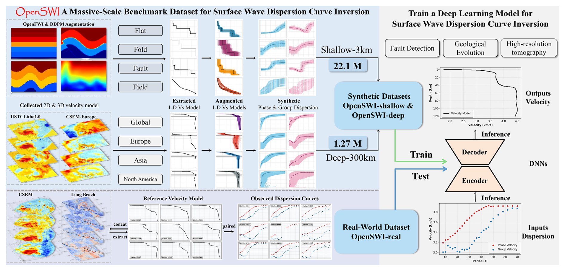 In recent years, rapidly developing deep learning methods have revolutionized the process of surface wave dispersion curve inversion. These data-driven approaches leverage deep neural networks, such as fully connected networks (FNNs), convolutional neural networks (CNNs), and Transformer networks, to learn the mapping between dispersion curves and subsurface shear wave velocity profiles (Hu et al., 2020; Yablokov et al., 2021; Wang et al., 2022; Cai et al., 2022; Huang et al., 2024; Liu et al., 2025; Jiang et al., 2025). By effectively eliminating reliance on initial models and iterative optimization, these methods significantly improve inversion efficiency and performance (Chen et al., 2025). Once trained, the models can rapidly invert large-scale datasets in seconds, making them well-suited for real-time applications, such as field deployment and imaging. However, their performance and generalization ability are strongly influenced by both the quality and diversity of the training data (Luo et al., 2022). Previous research has demonstrated that large-scale, diverse datasets substantially enhance deep model performance, particularly in scenarios with no labeled data (zero-shot learning) or limited labeled data that requiring fine-tuning (few-shot learning) (Luo et al., 2022; Liu et al., 2025). Therefore, the development of dispersion curve datasets that encompass representative geological features, multi-scale structures, and sufficient sample sizes is crucial for advancing intelligent inversion methods.
