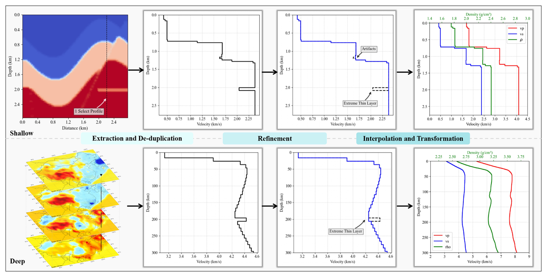 Interpolation and standardization. Uniform layer-thickness interpolation was applied to ensure model consistency across different application scenarios. For shallow subsurface models, layers were resampled at 40 m intervals, whereas for deep-Earth models, a coarser 1 km interval was adopted. This standardization facilitated large-scale batch processing and streamlined integration with deep learning frameworks. We note, however, that some studies may prefer non-uniform layer-thickness schemes (e.g., finer resolution in the shallow part and coarser resolution at greater depths). To support such flexibility, users can easily regenerate alternative dataset versions using the original construction scripts we provide.