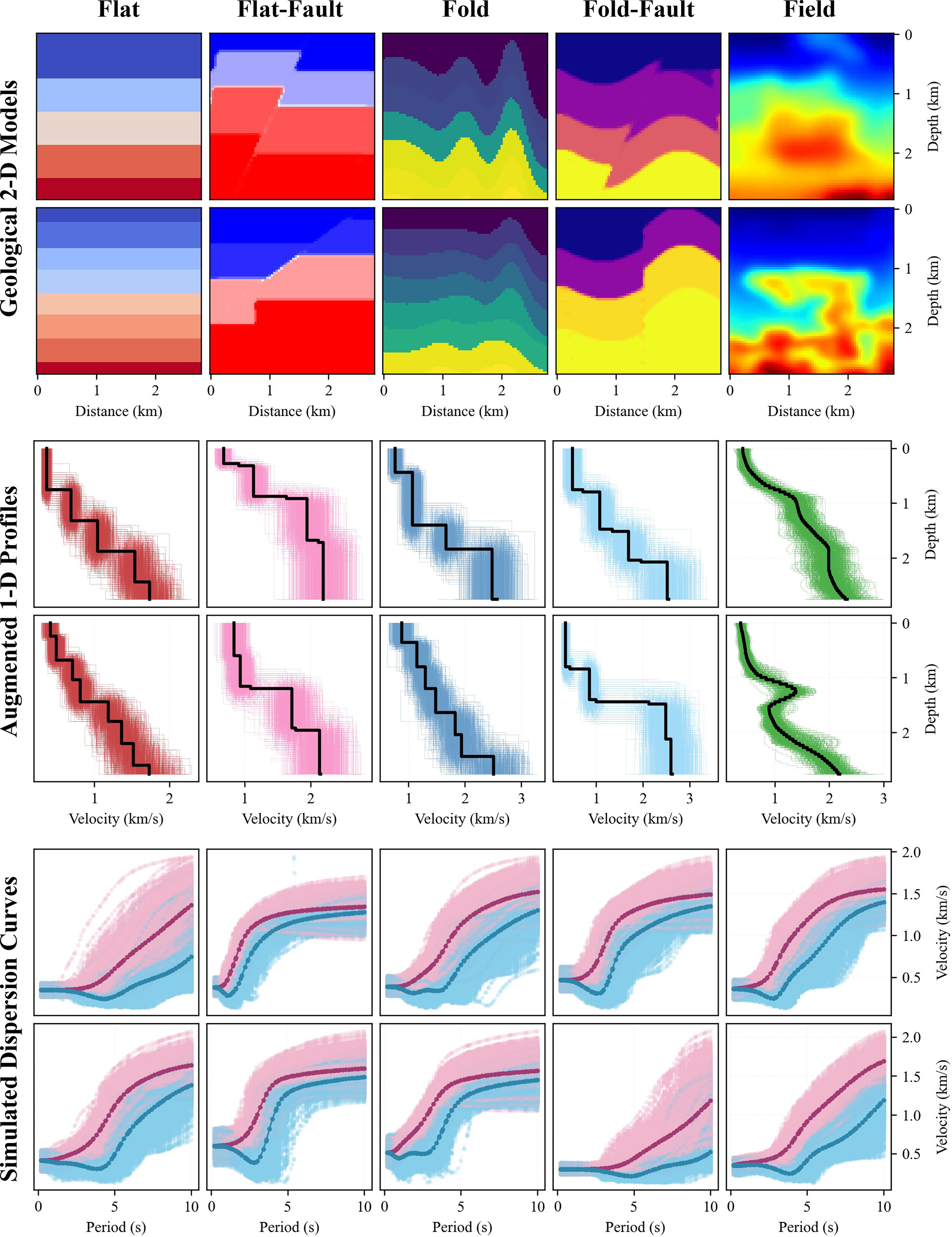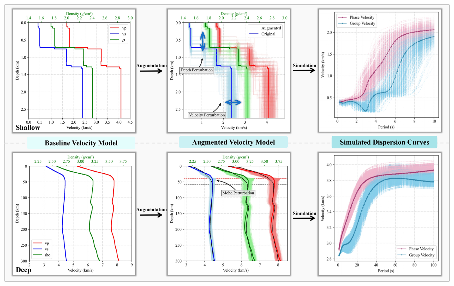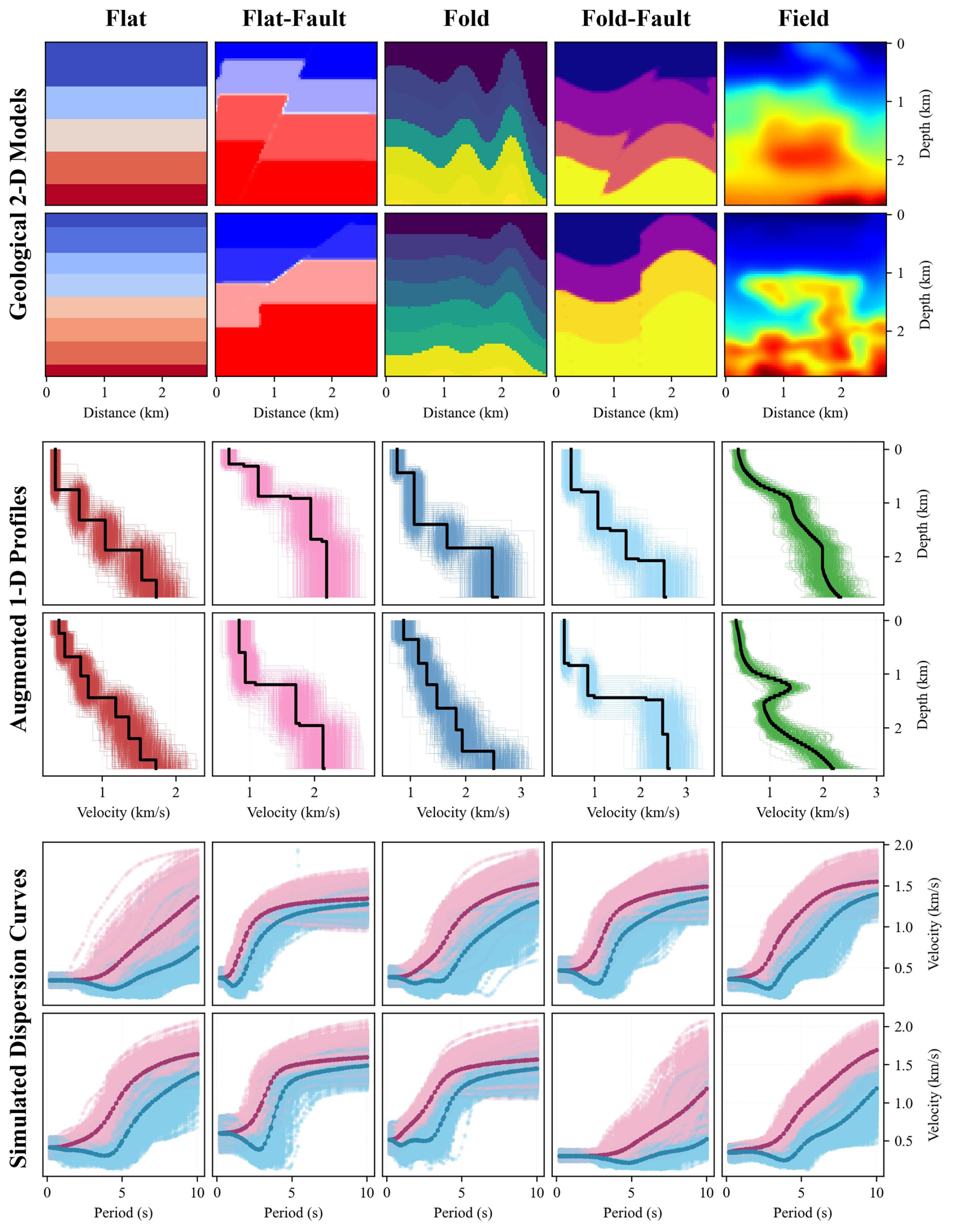 To address these challenges, synthetic surface wave dispersion curve data have emerged as a feasible alternative. Synthetic data, generated through a series of forward modeling processes, can effectively simulate field-observed dispersion curves. Since the corresponding velocity profiles are known in the simulation, this method naturally avoids pairing errors. Deep neural networks trained on synthetic data have demonstrated good applicability and inversion performance in shallow subsurface geological exploration (Cao et al., 2020; Aleardi and Stucchi, 2021; Yablokov et al., 2021, 2023; Gan et al., 2024) and deep structural imaging (Hu et al., 2020; Wang et al., 2022; Huang et al., 2024; Jiang et al., 2025; Liu et al., 2025). However, existing publicly available datasets are still largely limited to specific geological features or particular regions, lacking sufficient geological diversity and regional coverage. Given the complexity of shallow geology and the regional variability of deep structures, constructing a synthetic dataset with greater geological complexity, broader coverage, and larger sample sizes is essential for improving the generalization ability and practical applicability of models.