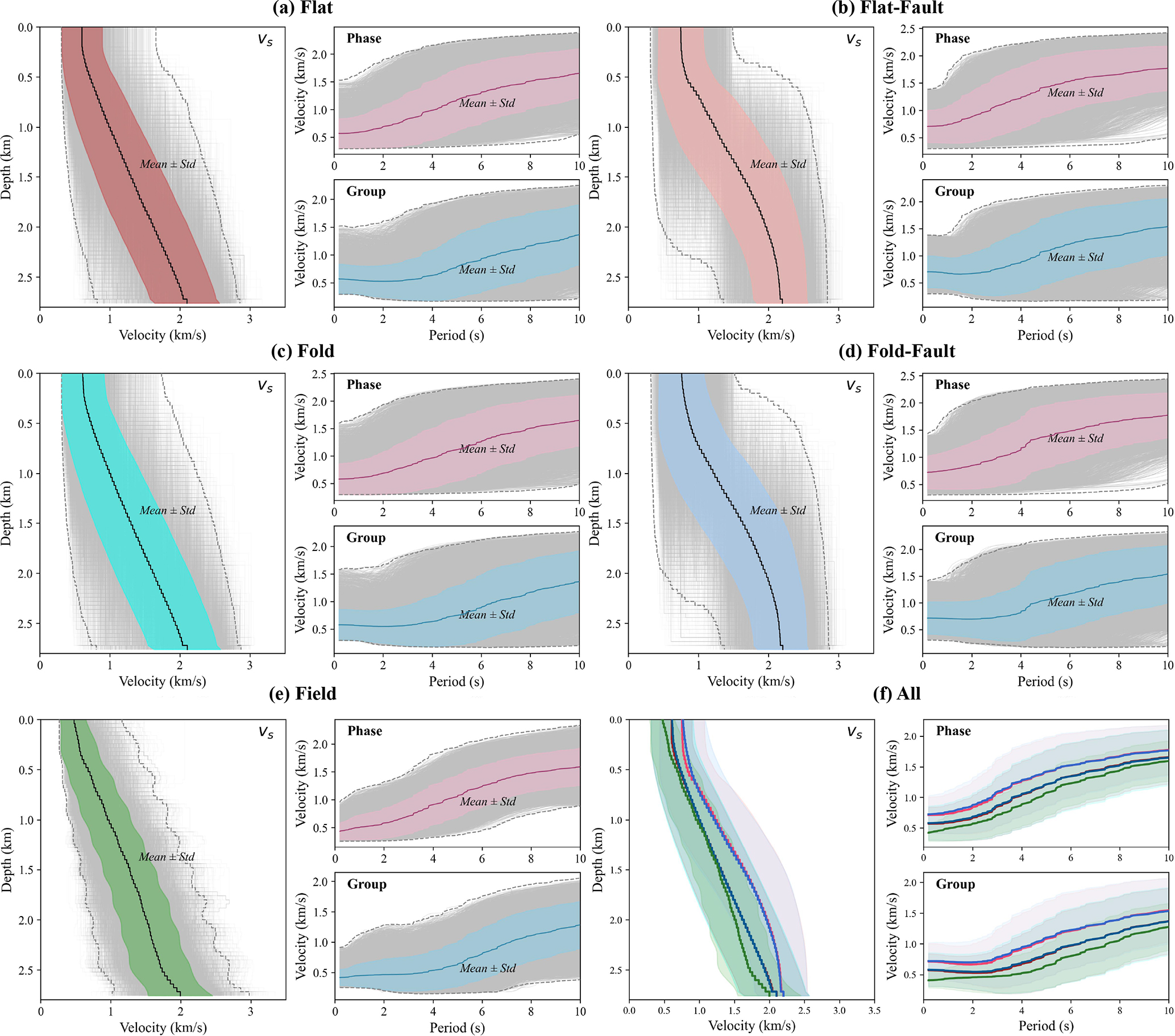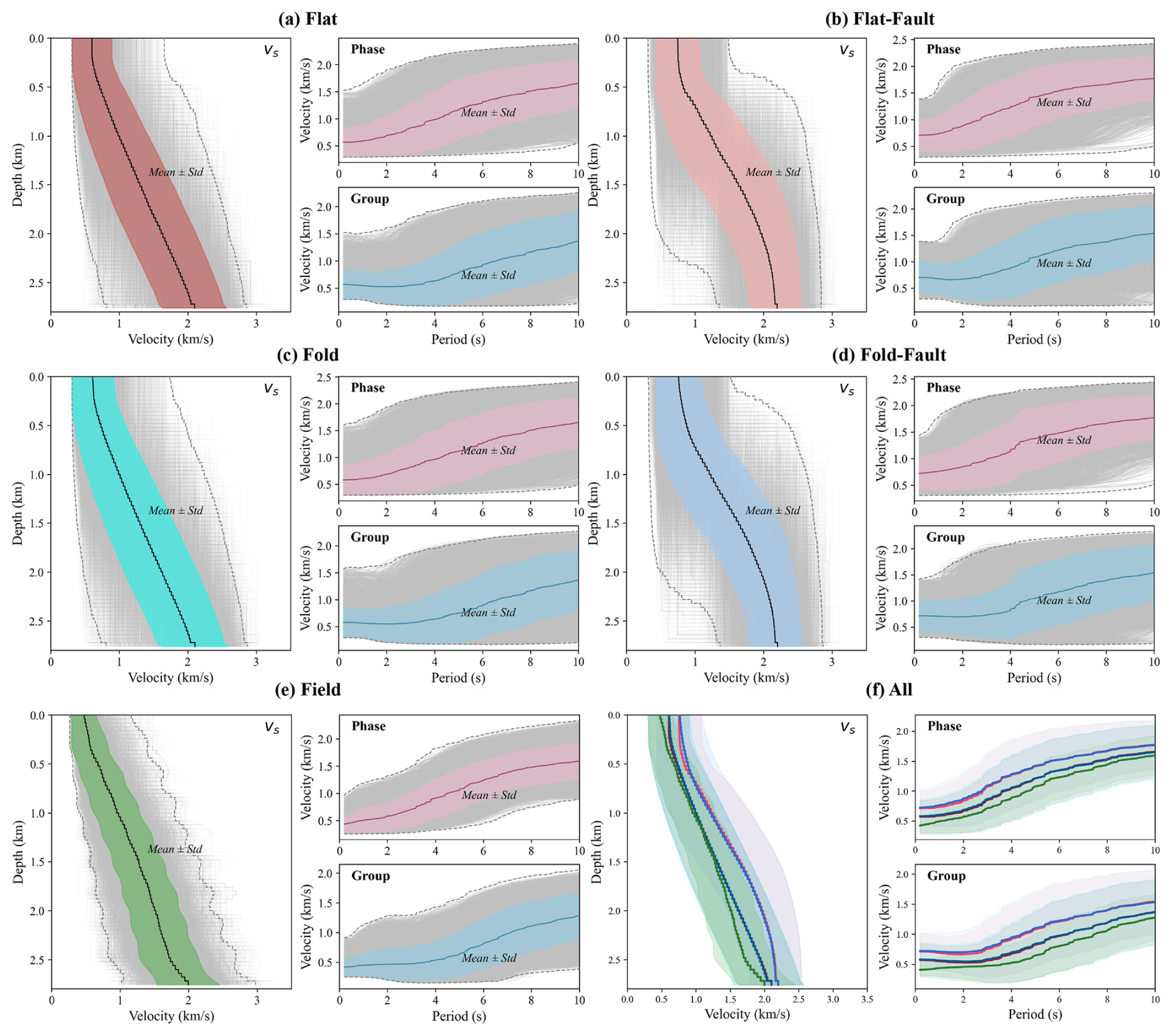 Figure 5Statistical characteristics of the OpenSWI-shallow dataset. Distribution of 1-D velocity profiles and corresponding dispersion curves for each geological style: (a) Flat, (b) Flat-Fault, (c) Fold, (d) Fold-Fault, (e) Field. The black lines represent the mean, and the shaded regions indicate the ±1 standard deviation range. Panel (f) summarizes the mean and variance across the five geological subsets.