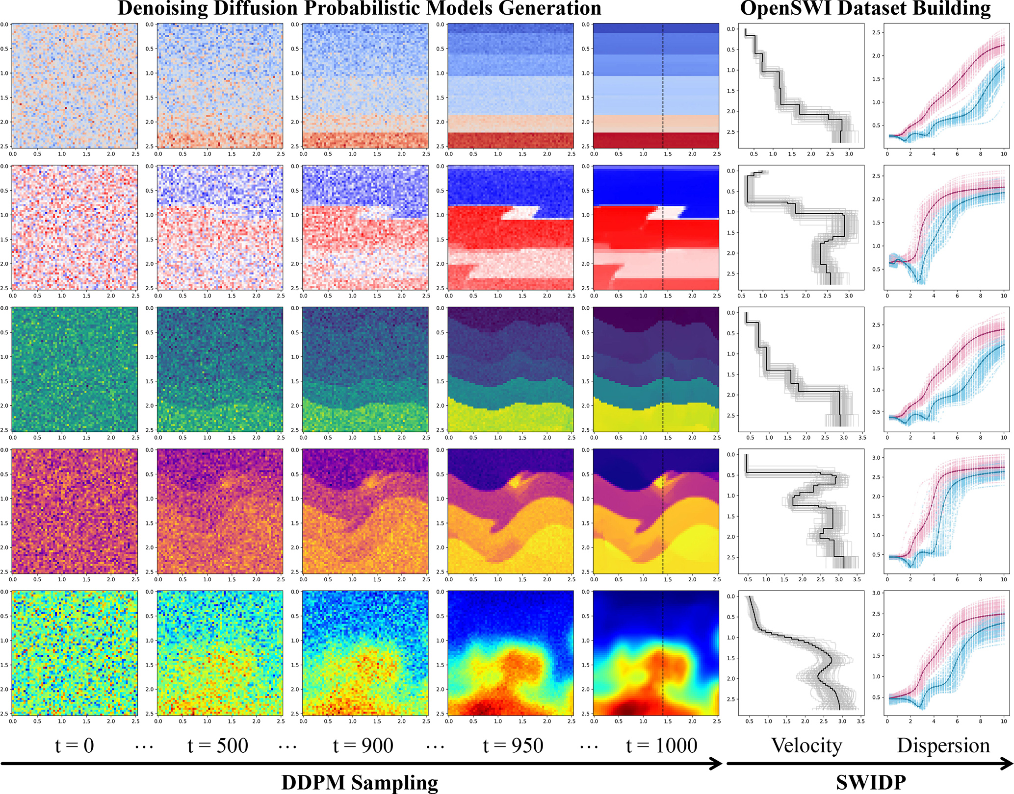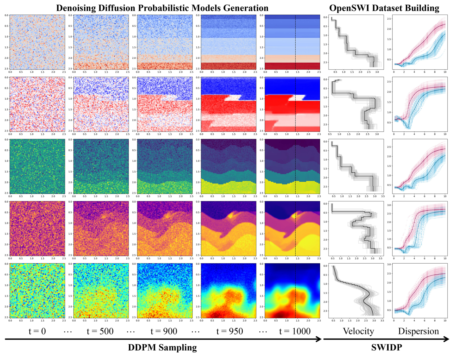 Figure 6Continual expansion of the OpenSWI-shallow dataset using a diffusion-based generative module. The left panel illustrates a 1000-step denoising trajectory, where Gaussian noise is progressively transformed into 2-D velocity models with realistic geological structures. The right panel presents representative 1-D velocity profiles extracted from the generated models, along with their corresponding Rayleigh-wave dispersion curves simulated using the SWIDP pipeline.