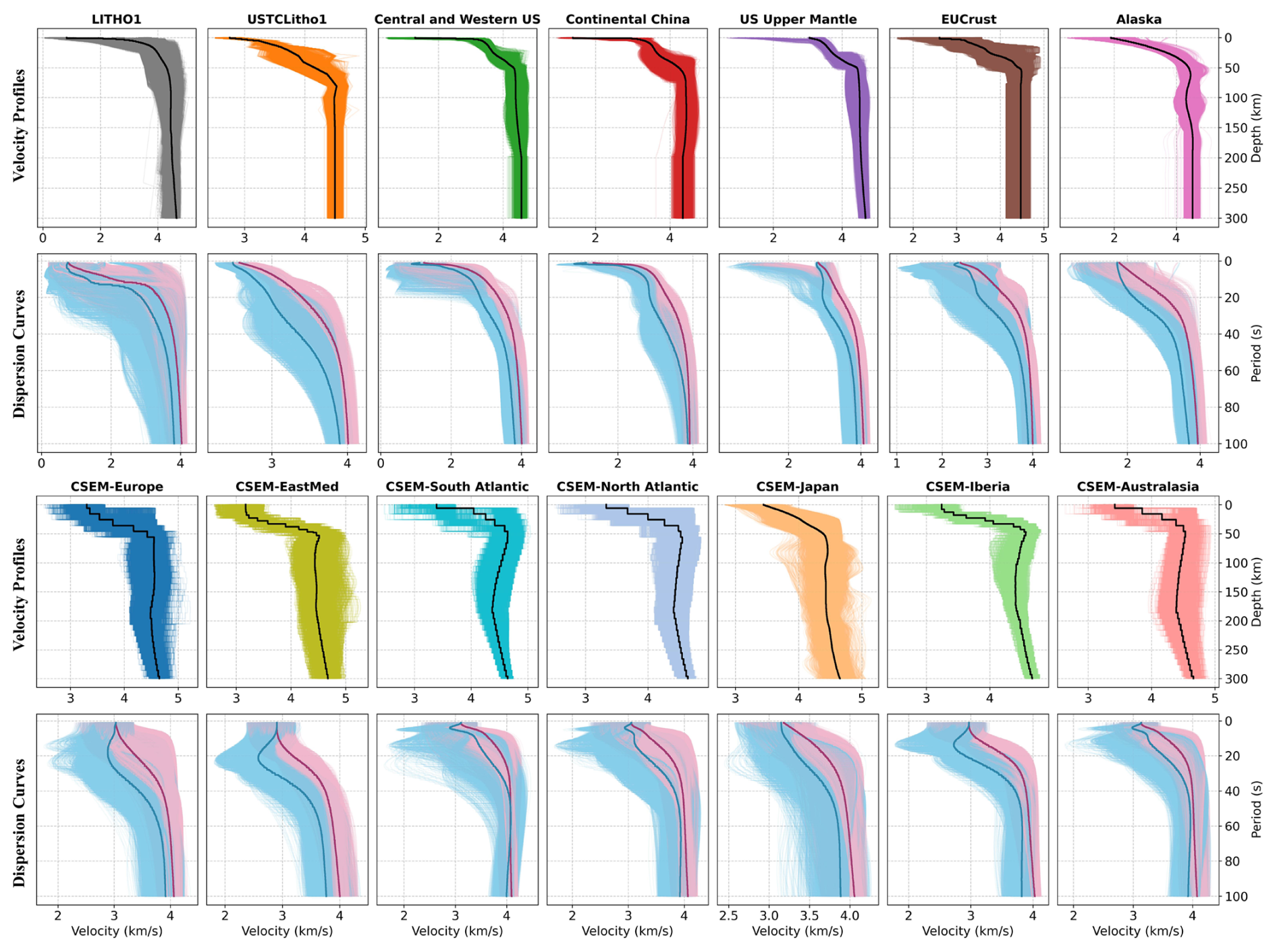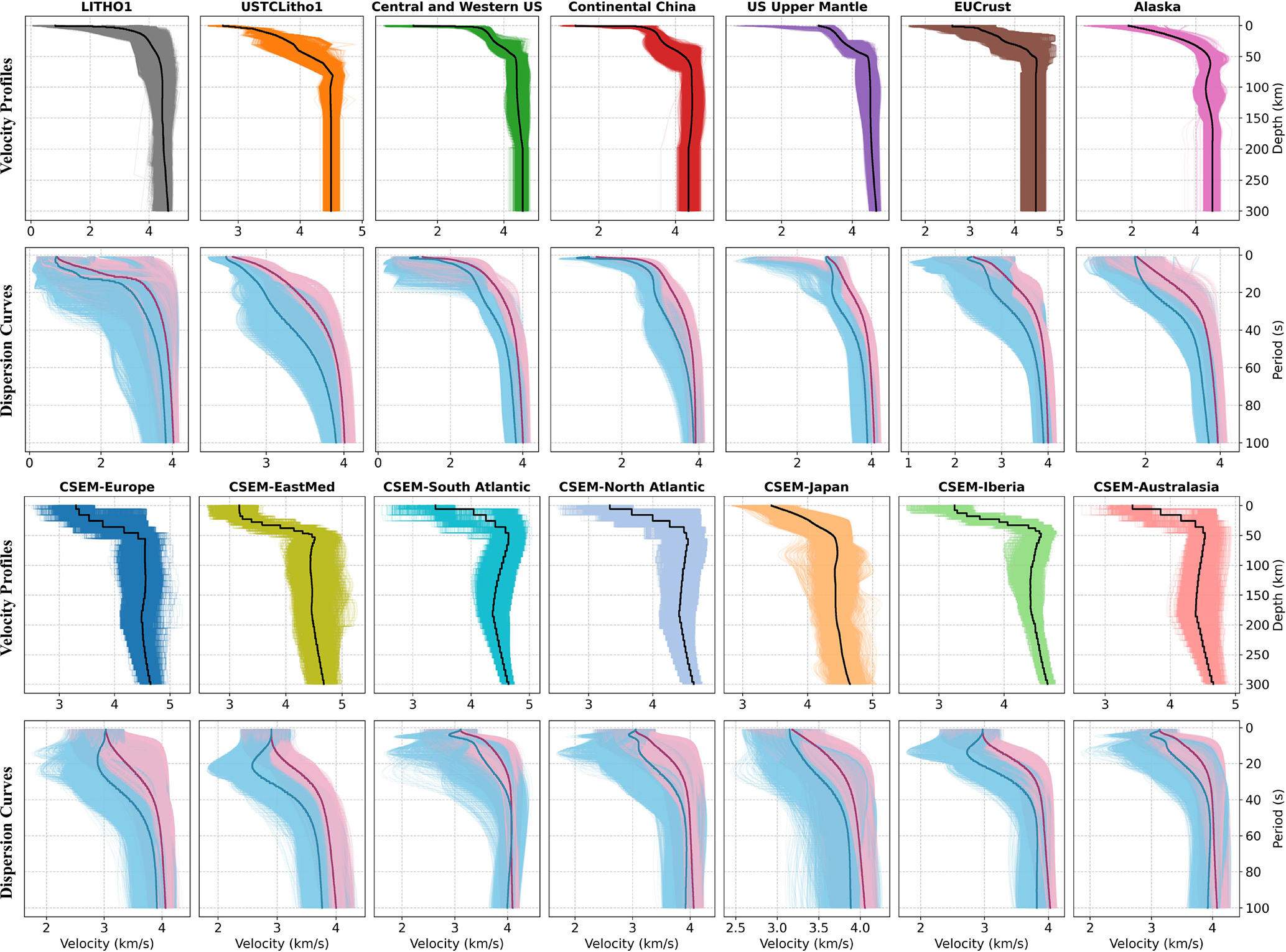 We also included several regional models from The Collaborative Seismic Earth Model Project (CSEM), constructed through full-waveform inversion (Fichtner et al., 2006, 2013, 2018). These cover Europe (Çubuk-Sabuncu et al., 2017; Blom et al., 2020), the Eastern and Western Mediterranean (Blom et al., 2020; Fichtner and Villaseñor, 2015), the South and North Atlantic (Colli et al., 2013; Rickers et al., 2013; Krischer et al., 2018), the Japanese Islands (Simutė et al., 2016), and Australasia (Fichtner et al., 2009, 2010). These models are characterized by high resolution and structural consistency and are widely used for deep Earth imaging and geodynamic research.