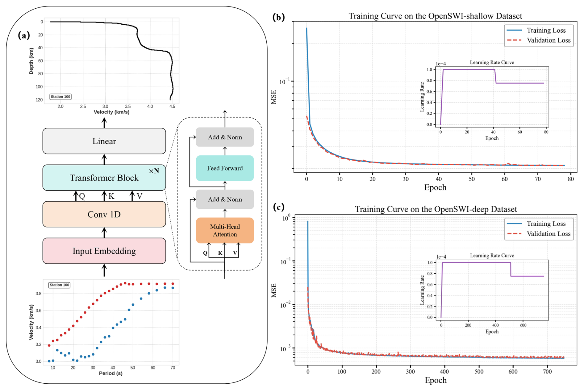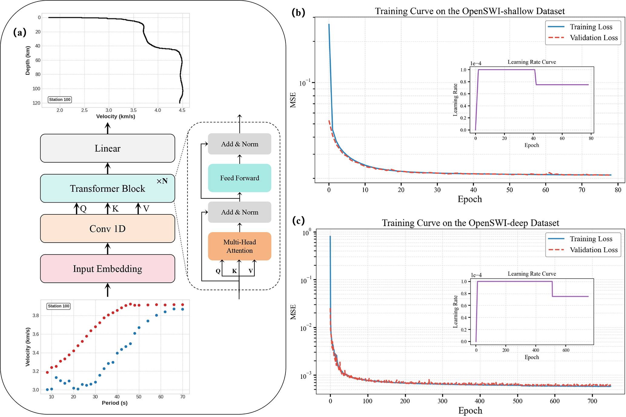 Figure 10(a) The architecture of the deep neural network (Transformer) used in this work for surface wave dispersion curve inversion. The Training (blue) and validation (red) loss curve on the (b) OpenSWI-shallow, and (c) OpenSWI-deep datasets. The learning rate curve are presents in the inner figure with purple line.