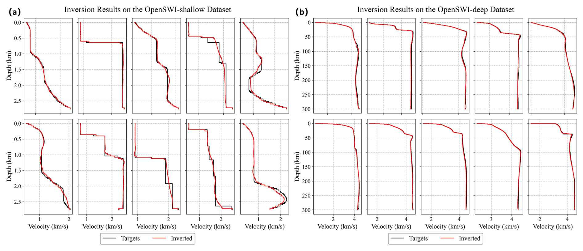 This workflow produced a large-scale, quality-controlled dataset of surface-wave dispersion curves. Figure 3 showcases examples of dispersion curves from the OpenSWI-shallow and OpenSWI-deep datasets. These simulated data provide a solid foundation for training deep learning–based inversion models, facilitating applications in resource exploration and imaging of Earth’s internal structure.