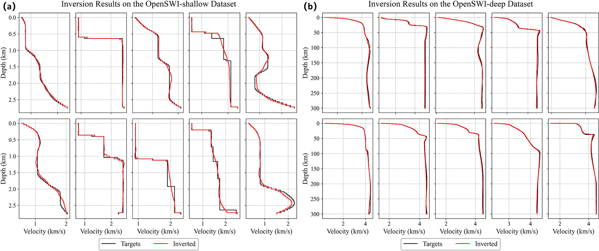 Beyond the quantitative accuracy presented in Table F1, an important practical distinction lies in the ability of different architectures to generalize to real observational datasets. The CNN/U-Net and FCNN models require fixed-length input representations and therefore cannot be directly applied to dispersion curves with varying sampling densities or period ranges, such as those encountered in the OpenSWI-real dataset. In contrast, the Transformer-based architecture naturally supports variable-length input sequences and can therefore be applied directly to real observational dispersion curves without additional preprocessing or retraining. These results highlight an important consideration for future deep-learning-based surface-wave inversion methods: in addition to achieving strong performance on synthetic benchmark datasets, inversion models should also possess sufficient flexibility to accommodate dispersion curves with varying period ranges and sampling densities commonly encountered in real-world applications.
