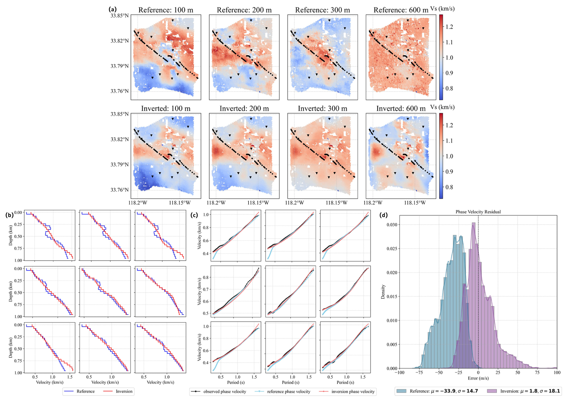 Disba(https://keurfonluu.github.io/disba, last access: 18 April 2026), adapted from the classical seismological software packageComputer Programs in Seismology (CPS)(Herrmann, 2013), to compute the dispersion curves. This tool efficiently calculates the fundamental-mode phase-velocity and group-velocity characteristics of Rayleigh waves and outputs complete period–velocity pairs (period, phase velocity, and group velocity) for each velocity model, ensuring comprehensive information for inversion tasks. -