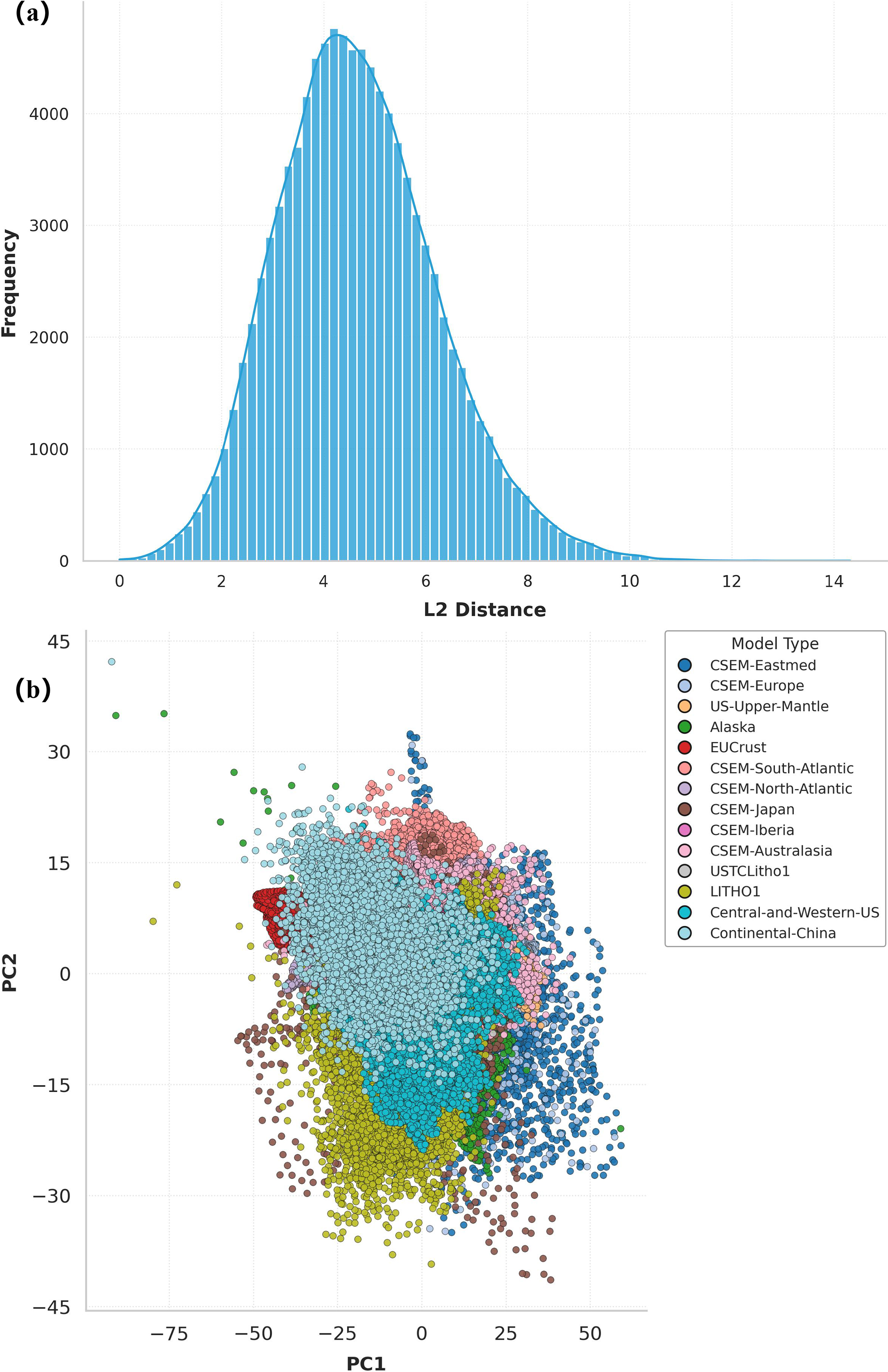 All collected 3-D velocity models underwent quality control, including duplicate removal, anomaly detection, gap interpolation, and format homogenization to ensure consistency for dataset construction. From the processed models, we extracted approximately 212 508 1-D velocity profiles, with detailed statistics for each data source provided in Table 2. A quantitative analysis of the diversity and similarity of the extracted 1-D velocity profiles is provided in Appendix D. To further increase diversity, each profile was augmented five times using a hierarchical strategy: the depth of the Moho discontinuity was first identified, and profiles were divided into crust and upper mantle sections. Each section was parameterized using cubic spline curves, with 3–6 control nodes for the crust and 6–12 nodes for the upper mantle, followed by random perturbations of the nodes to introduce structural variations. This augmentation preserved key geological features (e.g., the Moho interface) while significantly expanding the coverage and variability of the model library, ultimately yielding approximately 1.26 million augmented 1-D velocity models.