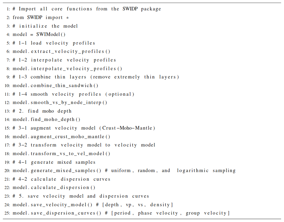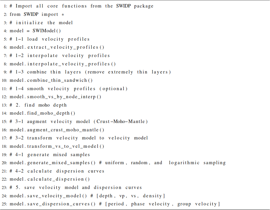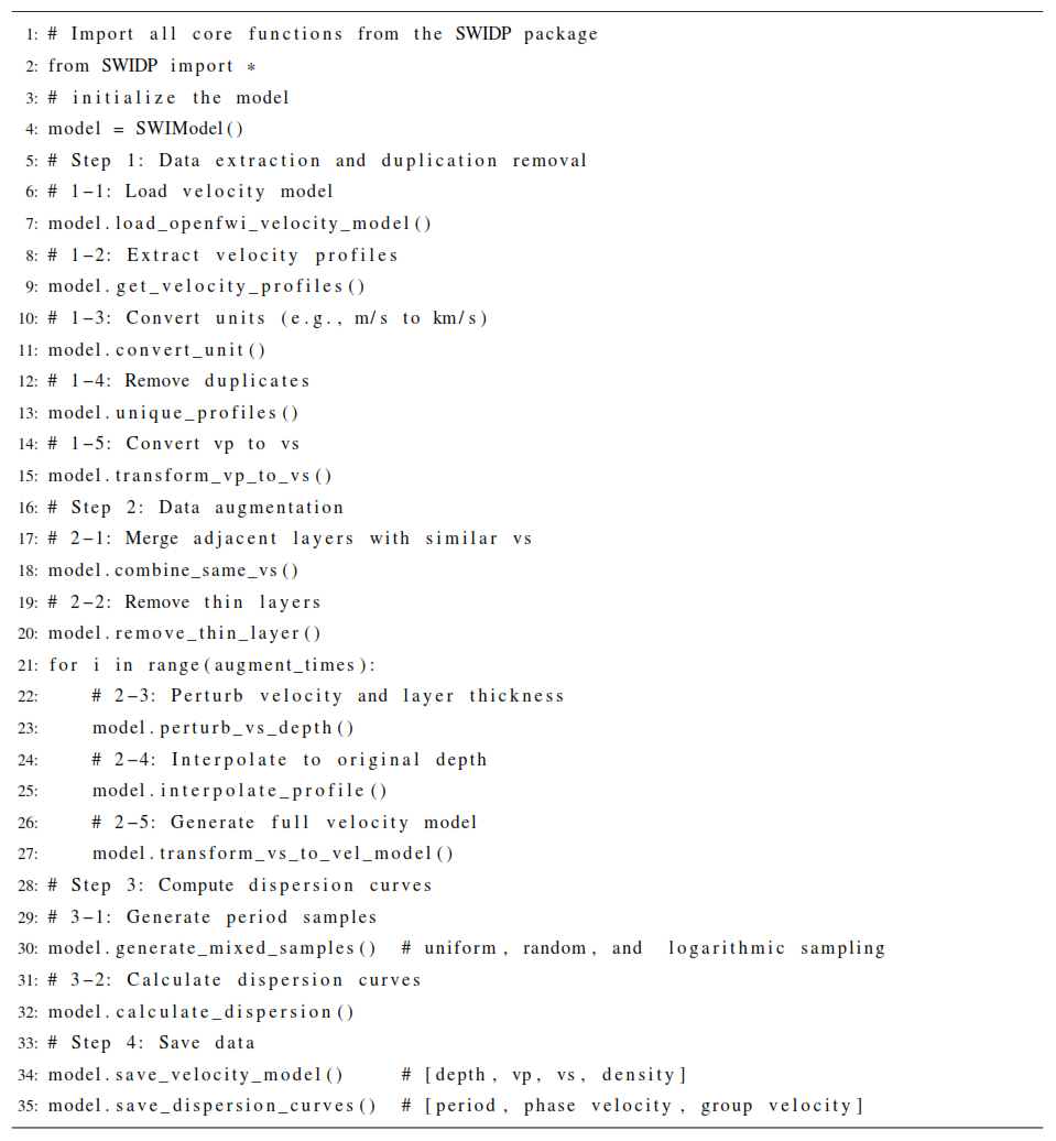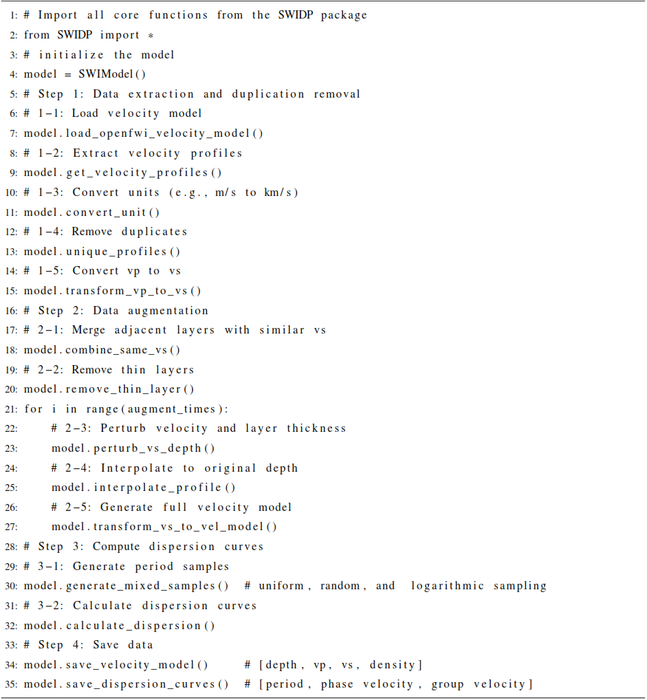 To promote reproducibility, scalability, and community engagement, we developed a standardized Python toolkit named SWIDP (Surface Wave Inversion Dataset Preparation pipeline). Built upon the key procedures described in Sect. 2.1.1–2.1.4, SWIDP encapsulates core functionalities such as the extraction and parameterization of 1-D velocity profiles, data augmentation, and large-scale dispersion curve simulation.