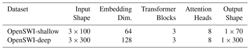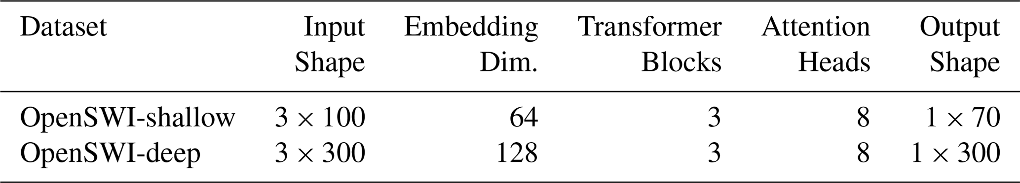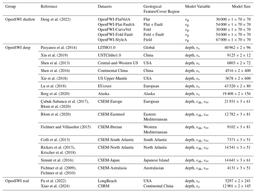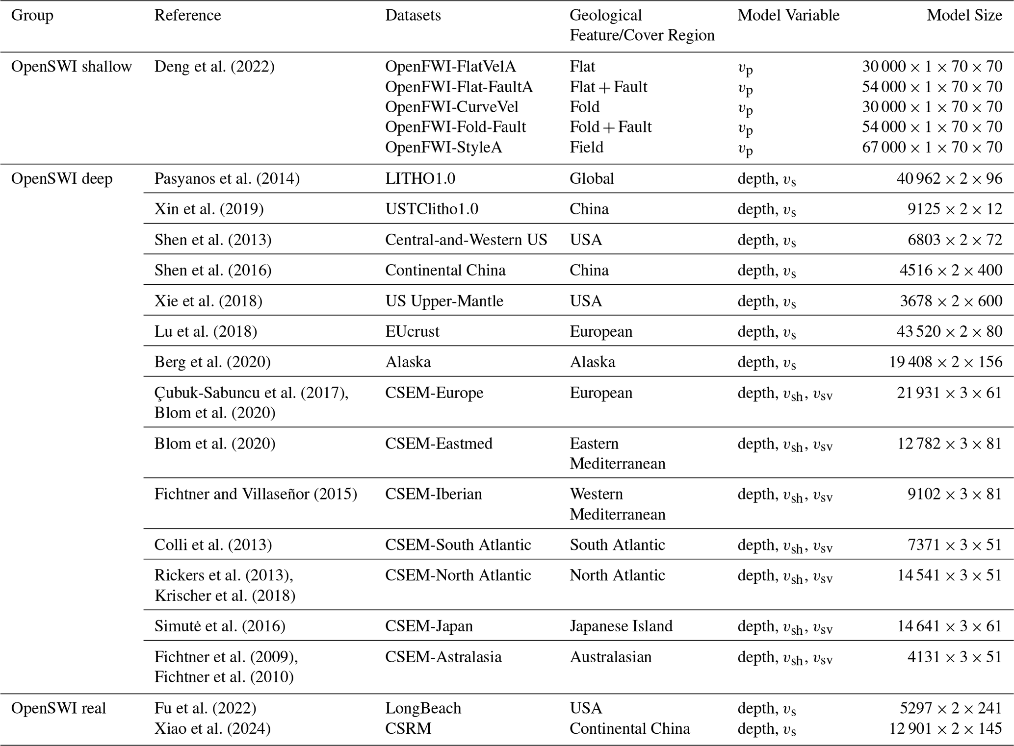Deng et al. (2022)Pasyanos et al. (2014)Xin et al. (2019)Shen et al. (2013)Shen et al. (2016)Xie et al. (2018)Lu et al. (2018)Berg et al. (2020)Çubuk-Sabuncu et al. (2017)Blom et al. (2020)Blom et al. (2020)Fichtner and Villaseñor (2015)Colli et al. (2013)Rickers et al. (2013)Krischer et al. (2018)Simutė et al. (2016)Fichtner et al. (2009)Fichtner et al. (2010)Fu et al. (2022)Xiao et al. (2024)Table 1Original data sources used in constructing the OpenSWI datasets, summarizing dataset categories (e.g., OpenSWI-shallow, OpenSWI-deep, and OpenSWI-real), references, primary geological settings (e.g., Flat, Flat-Fault, Fold, Fold-Fault, and Field) or geographic coverage (e.g., global, China, Europe, the United States), recorded velocity parameters (e.g., P-wave velocity vp, S-wave velocity vs, combined shear-horizontal velocity vsh, and shear-vertical velocity vsv), as well as the size of the raw data, expressed as N velocity profiles × M model variables × 2-D velocity model shape (for OpenSWI-shallow) or L layers (for OpenSWI-deep and OpenSWI-real).