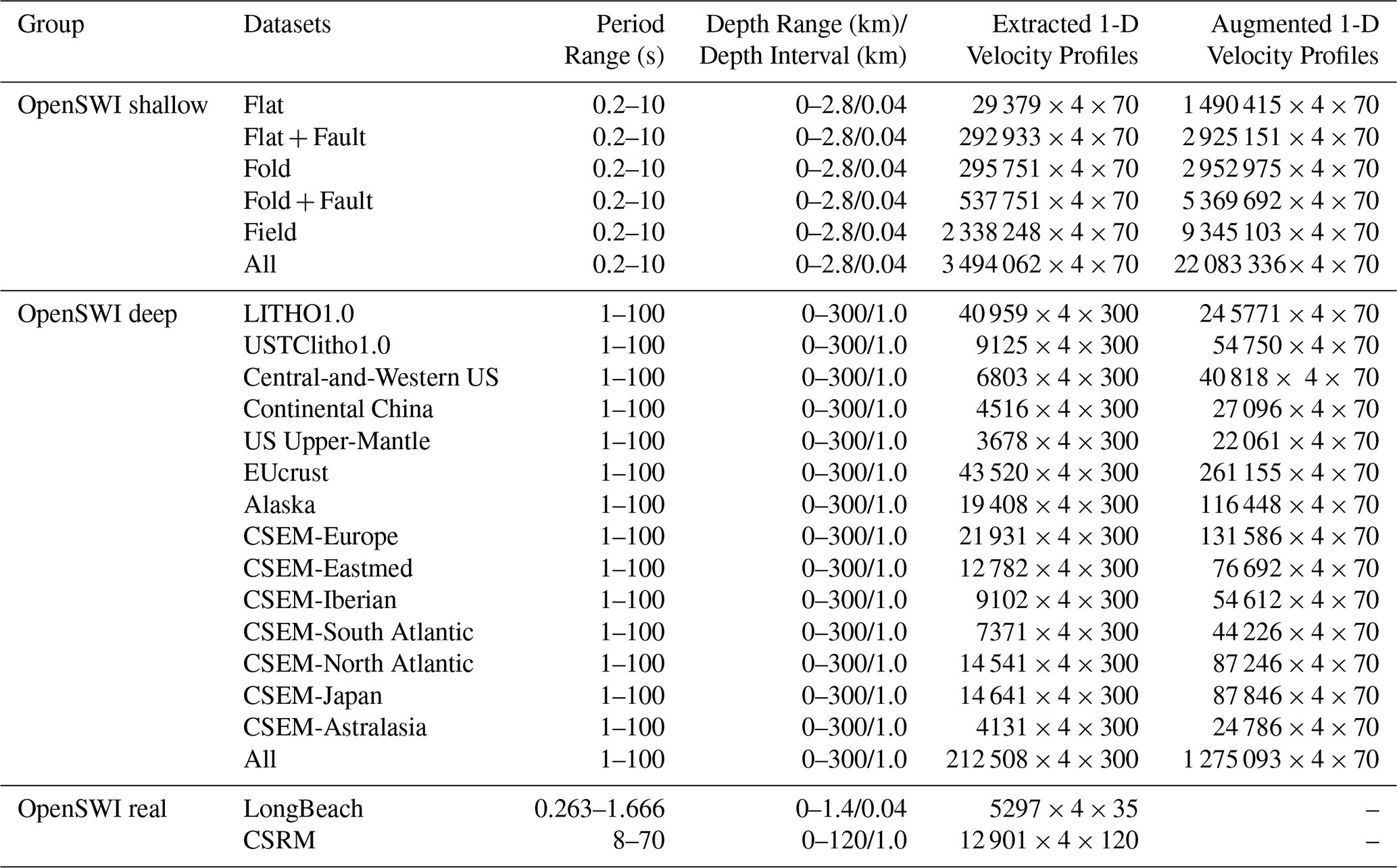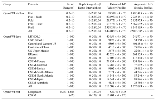 Table 2Comprehensive summary of the OpenSWI dataset, describing its categories (OpenSWI-shallow, OpenSWI-deep, and OpenSWI-real), associated period ranges (seconds, s), depth ranges (kilometers, km), and sampling intervals (kilometers, km), as well as the extracted and augmented 1-D velocity profiles (depth, vp, vs, ρ), expressed as N profiles × M model variables × L layers.
