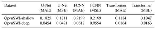 Table F1 summarizes the benchmarking results obtained using different network architectures and loss functions on the OpenSWI datasets. The results indicate that the Transformer-based architecture consistently achieves the lowest RMSE across both datasets and loss-function settings. The U-Net model exhibits comparable performance on the OpenSWI-shallow dataset but shows larger errors on the more challenging OpenSWI-deep dataset. In contrast, the FCNN model yields relatively higher errors overall, suggesting that its limited representational capacity may restrict its ability to capture the complex nonlinear relationships between dispersion curves and subsurface velocity structures. Regarding the influence of the loss function, the RMSE values obtained using MSE and MAE are generally similar, with only minor variations between the two settings. This observation suggests that the overall inversion performance is primarily governed by the network architecture rather than the specific regression loss used during training.
