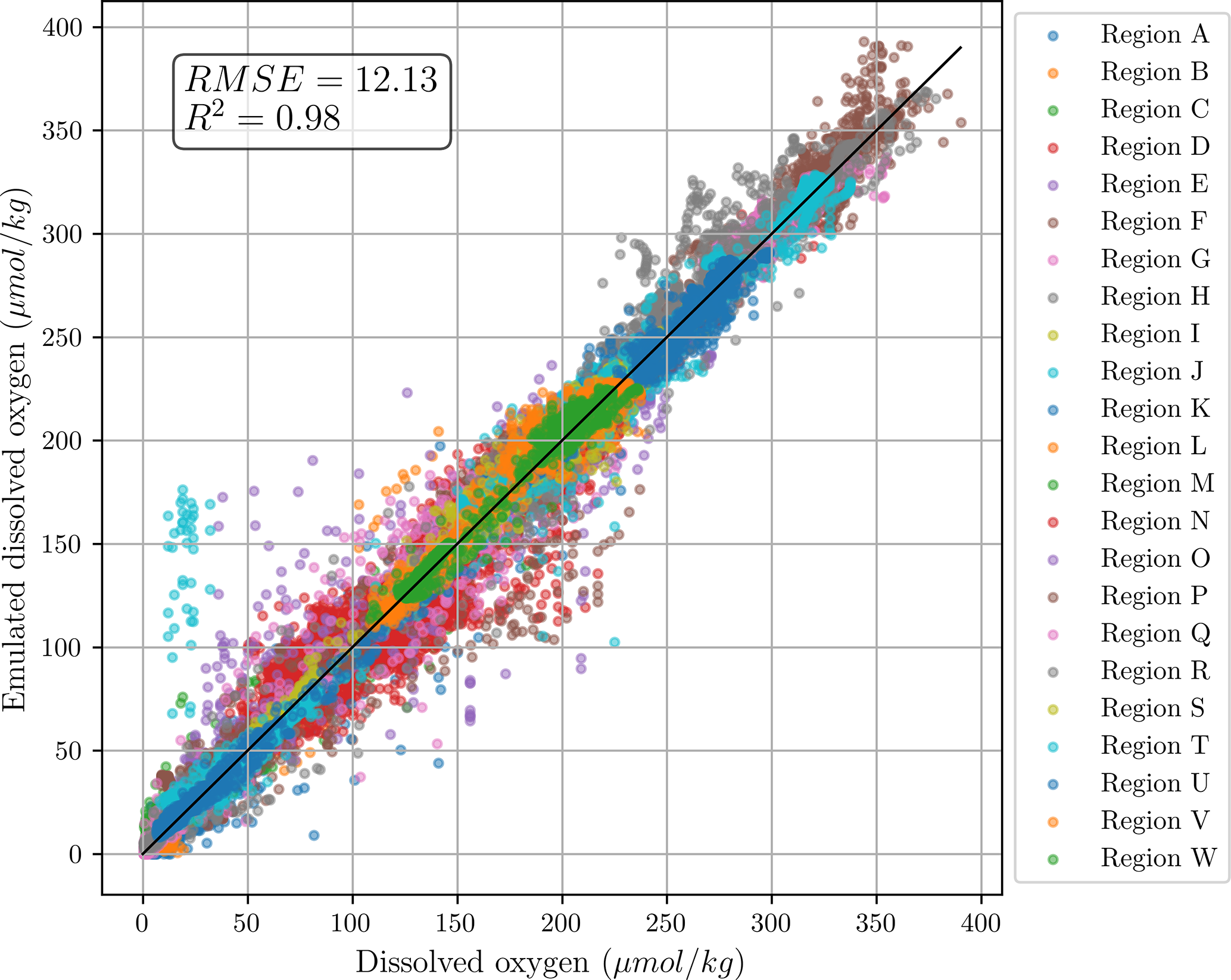 Figure 2Scatter plot of the emulated oxygen data with respect to the ground truth measurements. The plot includes emulated oxygen values across all depths and within all independent test regions. The locations of the independent test regions is given in Fig. 3.