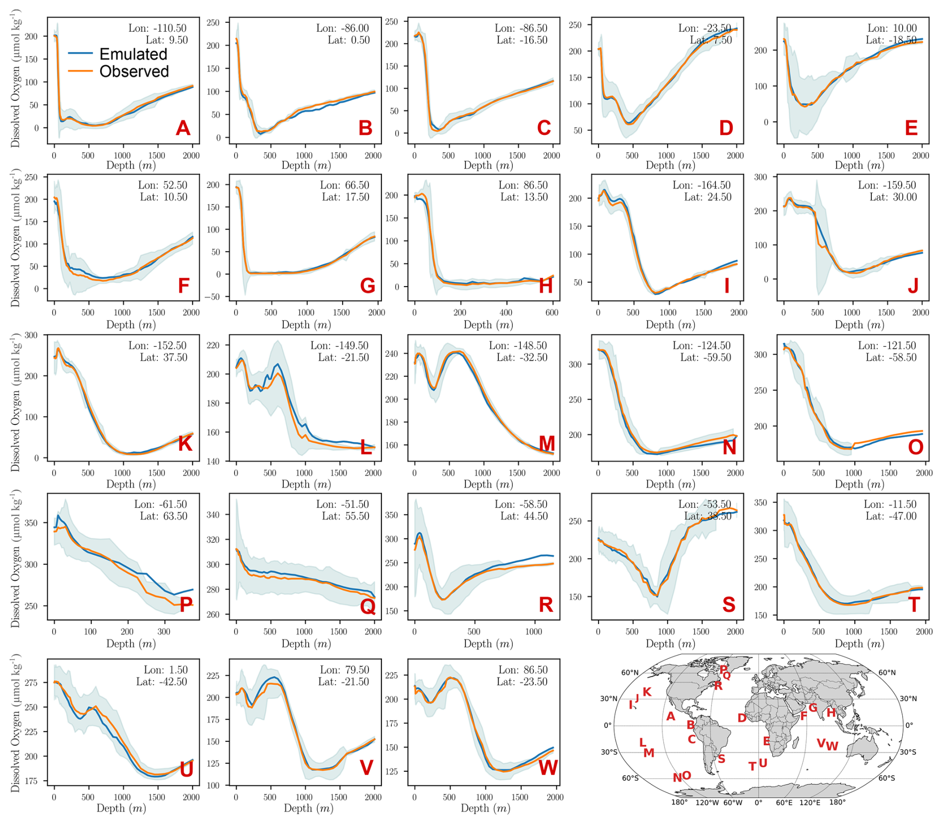 Figure 3Mean emulated oxygen profiles compared to the empirical distribution of observed oxygen profiles in the independent test regions. The mean emulated profile (orange) against the empirical distribution of observed dissolved oxygen profiles (blue line and shading) in the independent 1° ×1° test regions. The longitude and latitude of each of the 23 test regions are indicated in the corresponding panels. The locations of the test regions are also shown in the bottom-right corner of the figure.