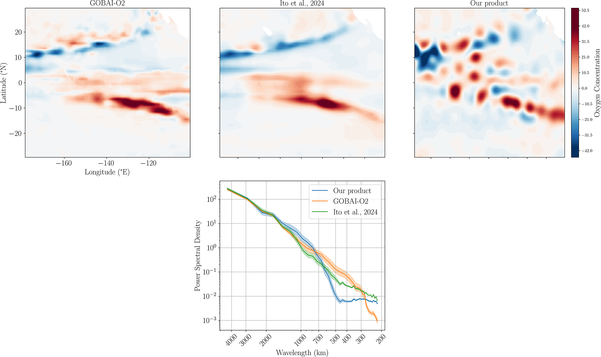 Beyond the climatological spatial distribution, we assess the spatial resolution of the proposed monthly DO product relative to state-of-the-art machine learning-based gridded datasets. Figure 6 presents an example of the DO anomaly field in the equatorial Pacific (−179 to −100° E, 30° S to 30° N) alongside the vertically and monthly averaged Radially Averaged Power Spectral Density (RAPSD) of our product, compared with GOBAI-O2 and Ito et al. (2024a). This region is characterized by energetic synoptic-scale variability (Chelton et al., 2007), and we evaluate whether our product better captures these processes. The RAPSD indicates 100 %–200 % higher energy levels at wavelengths around O(103) km, compared to the ML baselines, suggesting an improved representation of small-scale variability. This is further illustrated through the visual analysis of the anomaly field in Fig. 6, where our product better represents finer synoptic-scale structures on the order of O(103) km, revealing more energetic small-scale eddies than the other ML-based products. These variations are unlikely to result from interpolation biases associated with data scarcity, which would instead tend to produce near-zero anomalies. Likewise, the possibility that they arise from spurious or low-quality profiles is also unlikely, as similar patterns are consistently observed across the other ML-based products.