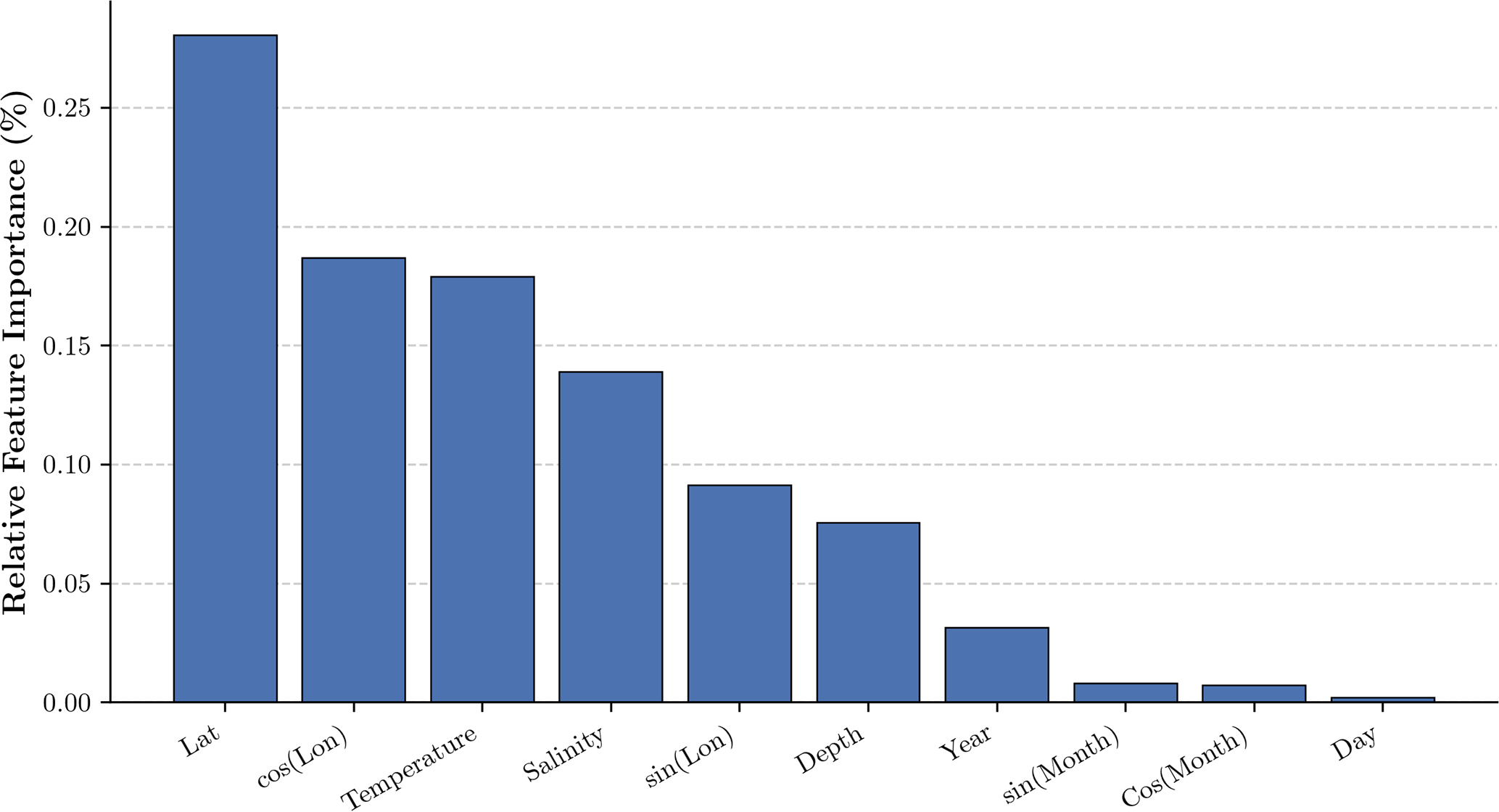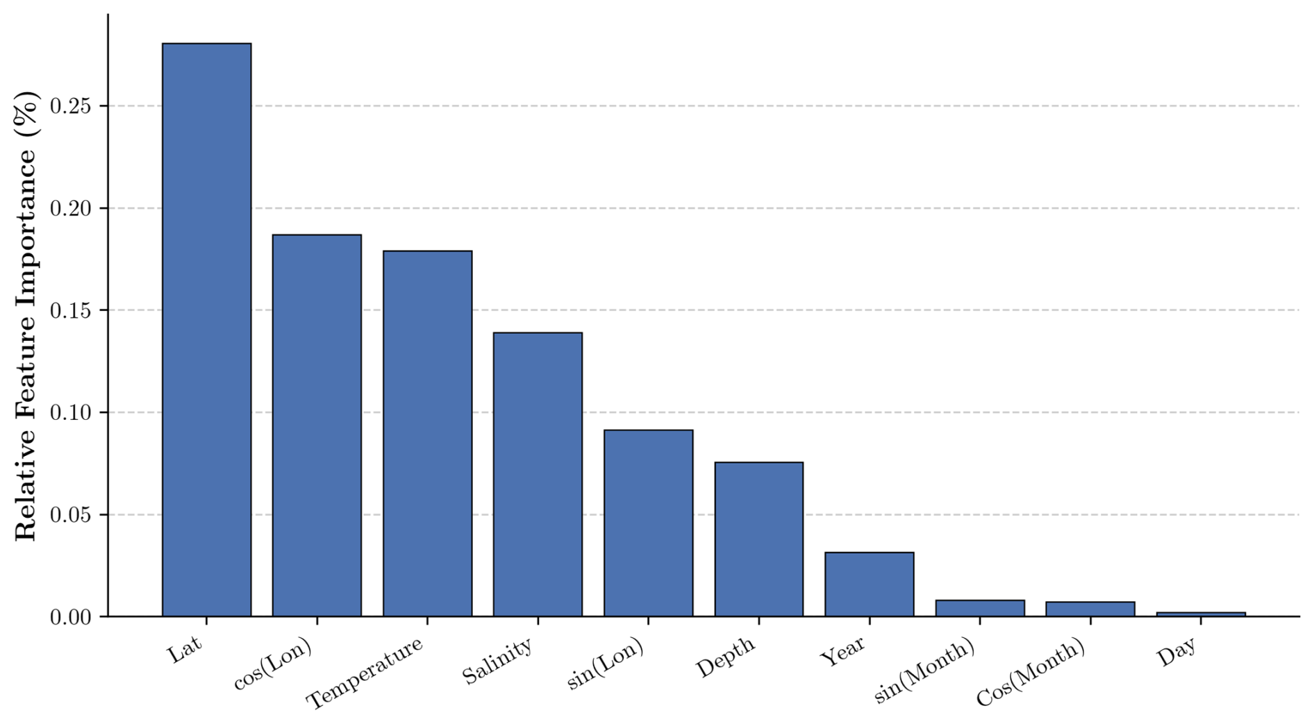 Overall, the most influential features are the geographical location of the profile (latitude and longitude) and the physical variables, namely temperature and salinity, while temporal information (year, month, day) has the least influence. Geographical location serves as a proxy for the various oceanographic regimes of ventilation and biogeochemistry that characterize different ocean regions (e.g., tropical vs. high-latitude regions, western boundary currents vs. OMZs). Temperature and salinity directly influence the solubility of oxygen in seawater, as well as stratification, water mass transformations, and mixing. The minimal contribution of time-related variables (year, month, day) likely reflects the fact that most of their information content – such as seasonality and the gradual, long-term deoxygenation trend – is already captured by the time-varying physical variables (temperature and salinity).