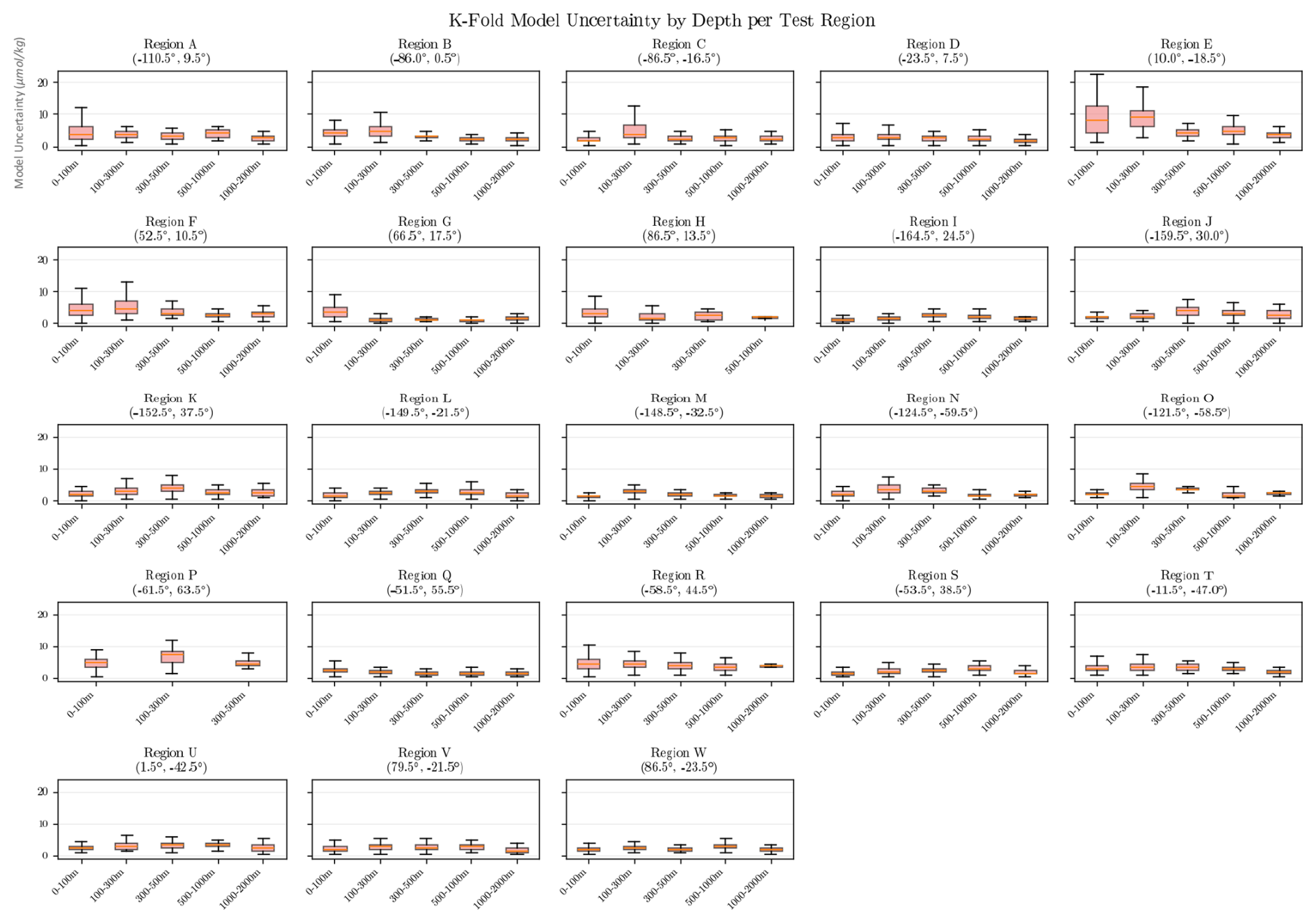 To identify potential trends and biases in the neural network model, we further evaluate the distribution of the difference between the emulated oxygen values and the observations in the independent test regions, as shown in Fig. 4. Overall, the boxplots indicate that the model accurately captures the variability of ocean oxygen across both space and time. Notably, larger errors are observed in the upper ocean layers, which correspond to higher oxygen concentrations. Additionally, higher errors are seen in the earlier years, likely due to the limited number of observations during this period.