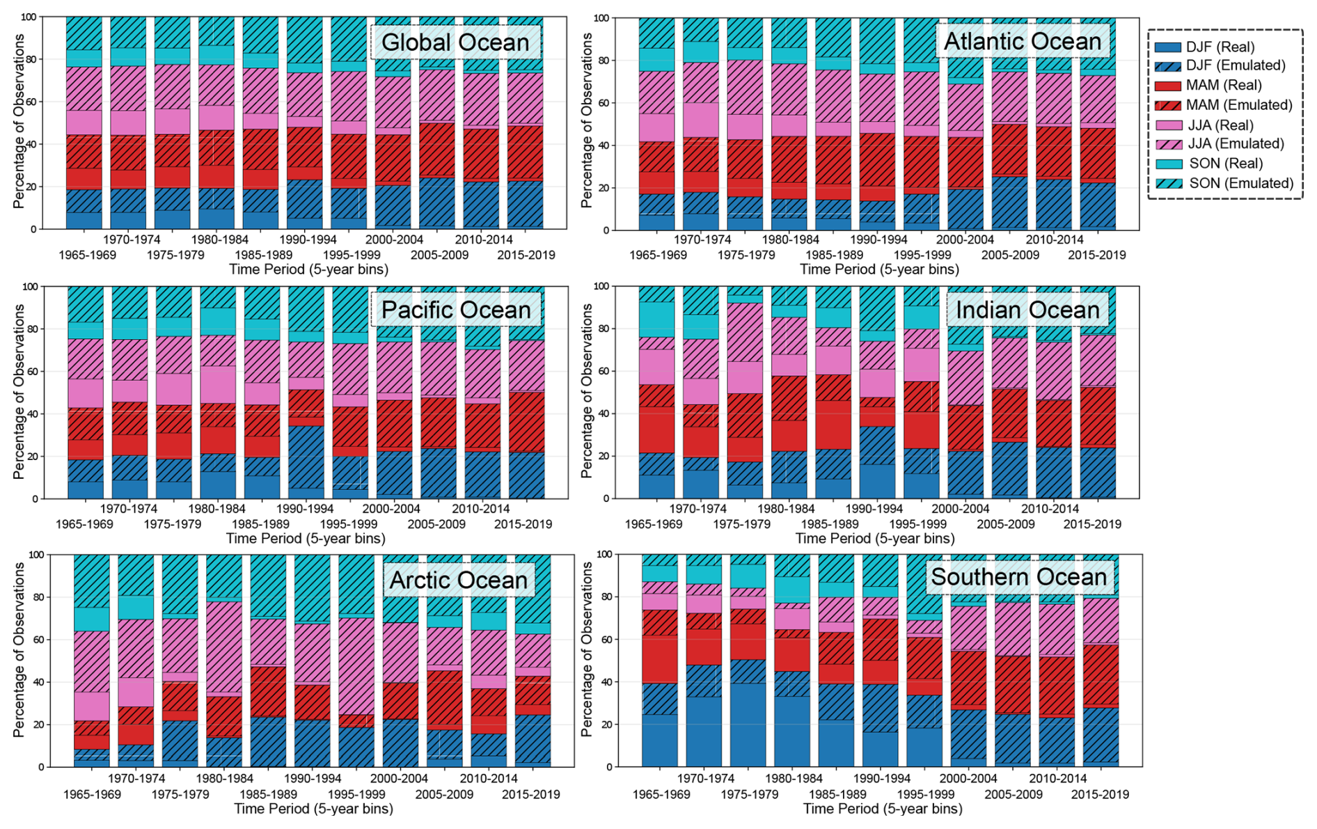 Figure D4Percentage of real and emulated data used in the interpolation by ocean region and season. Solid bars represent real observations, while hatched bars indicate the contribution of emulated observations.