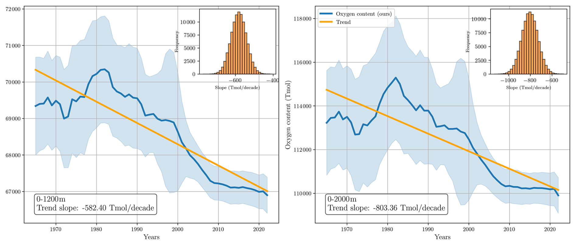 Figure D7Long-term changes in globally integrated oxygen inventory. The left panel shows the inventory for the upper 1200 m, while the right panel displays the inventory for the upper 2000 m. The histograms in each panel represent the empirical distribution of the deoxygenation rate, computed from a Monte Carlo simulation with 10 000 realizations.